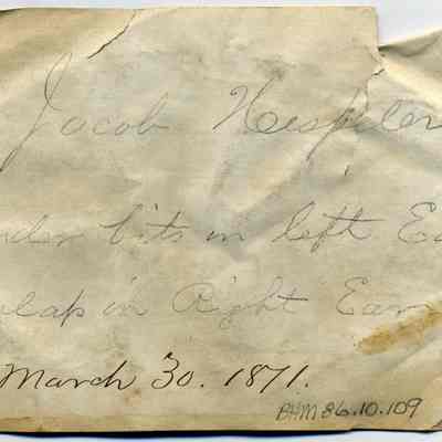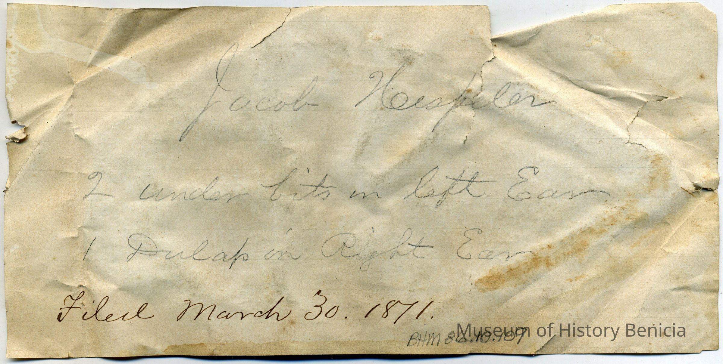 Sample brand/earmarkings on a piece of leather and paper for Jacob Hespeler, registered on March 30, 1871, as written in a Ledger of the Solano County Recorder 1855-1916. (page 80)