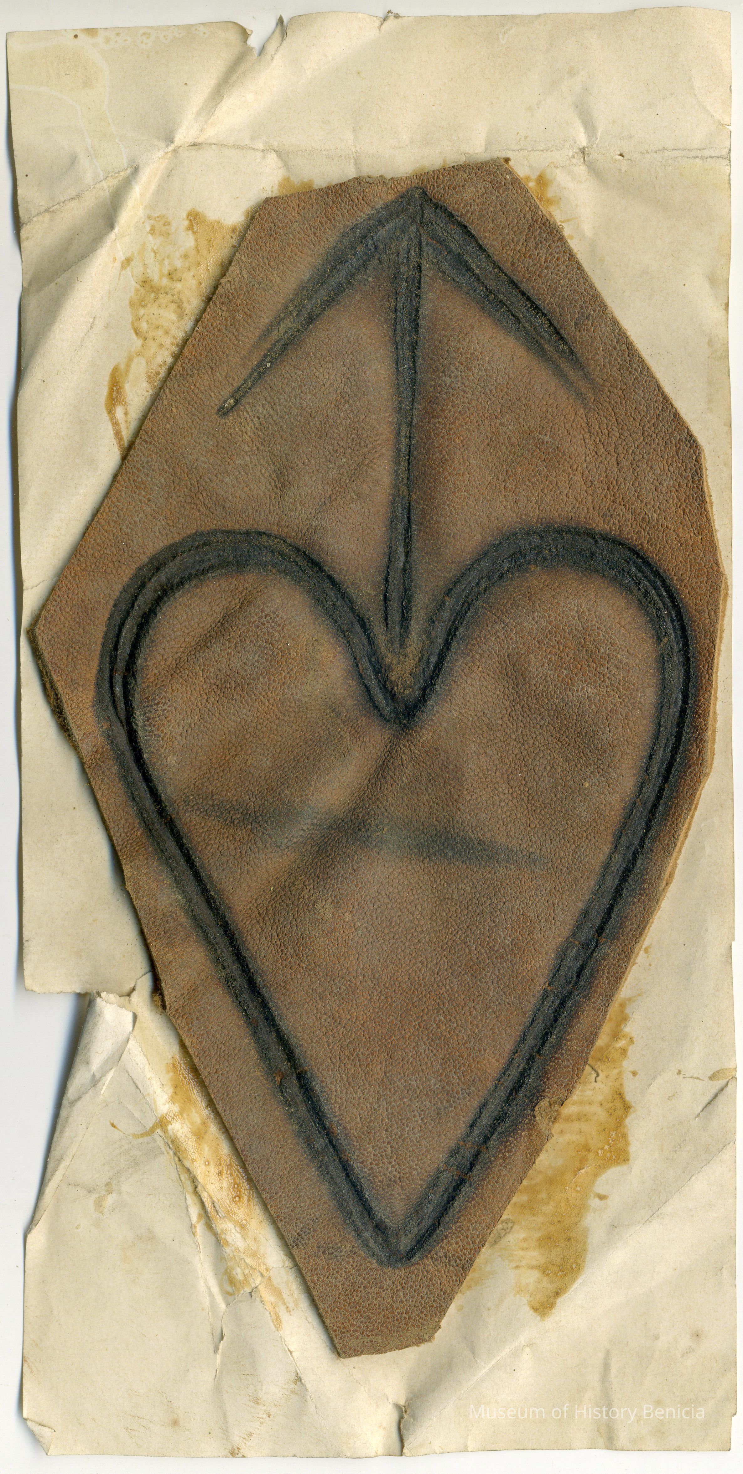 A partial copy of the original recording is adhered to the back of the leather describing the earmarkings. The brand is a heart with an arrow going up from the center top of the heart.6.Collection
