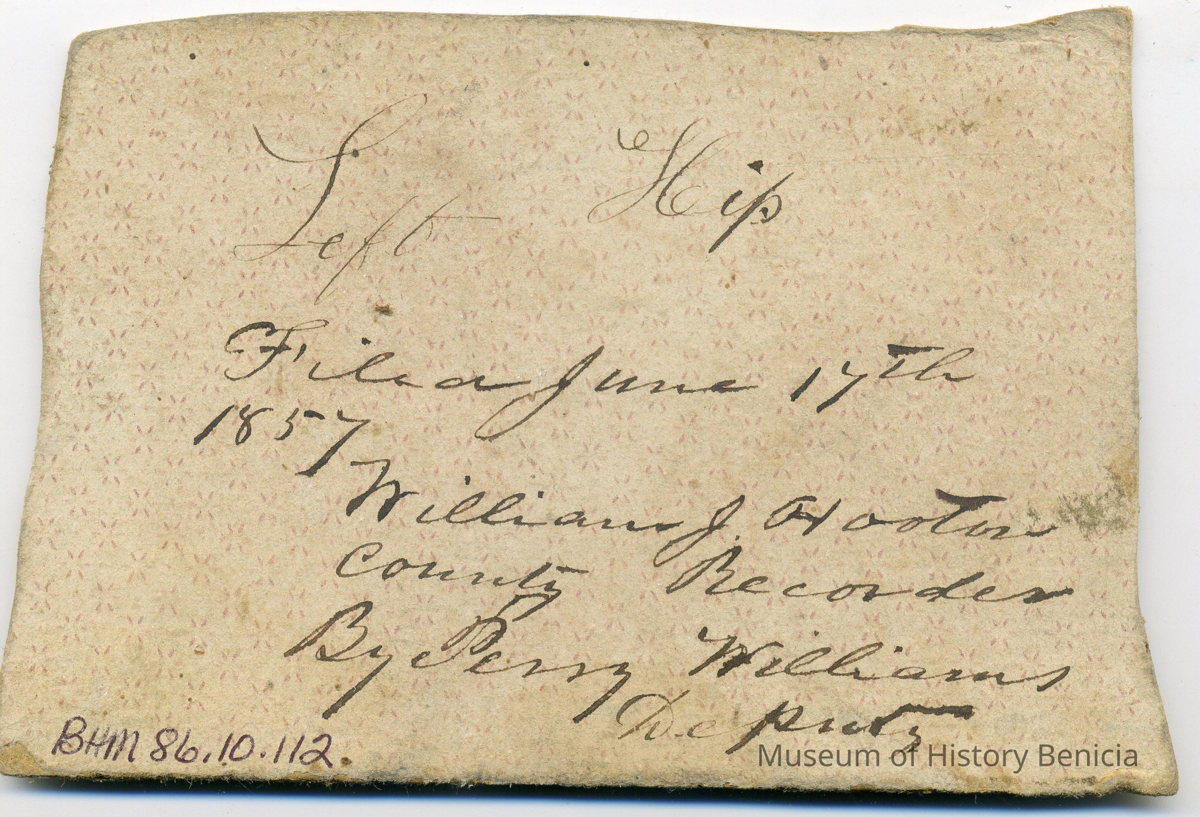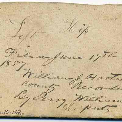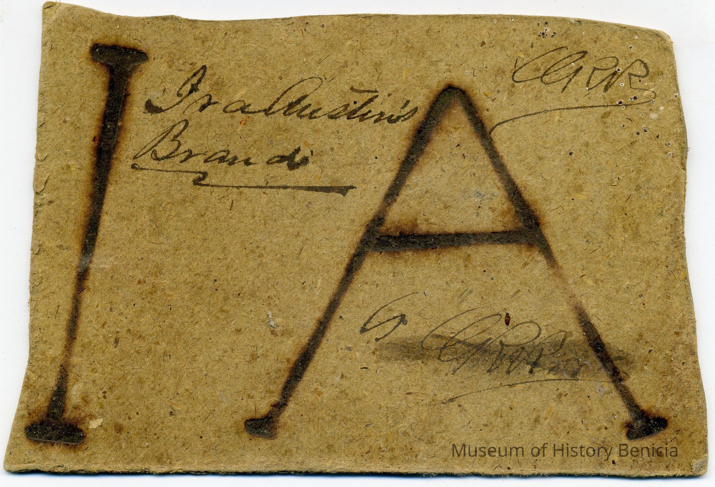Sample brand on a piece of cardboard for Ira Austin, registered on June 17, 1857, as written in a Ledger of the Solano County Recorder 1855-1916. (page 19)