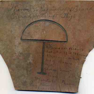 No copy of the original recording is adhered to the back of the leather, however information is written on the front in ink. The brand is a picture of an open umbrella and is placed on the left thigh.Collection