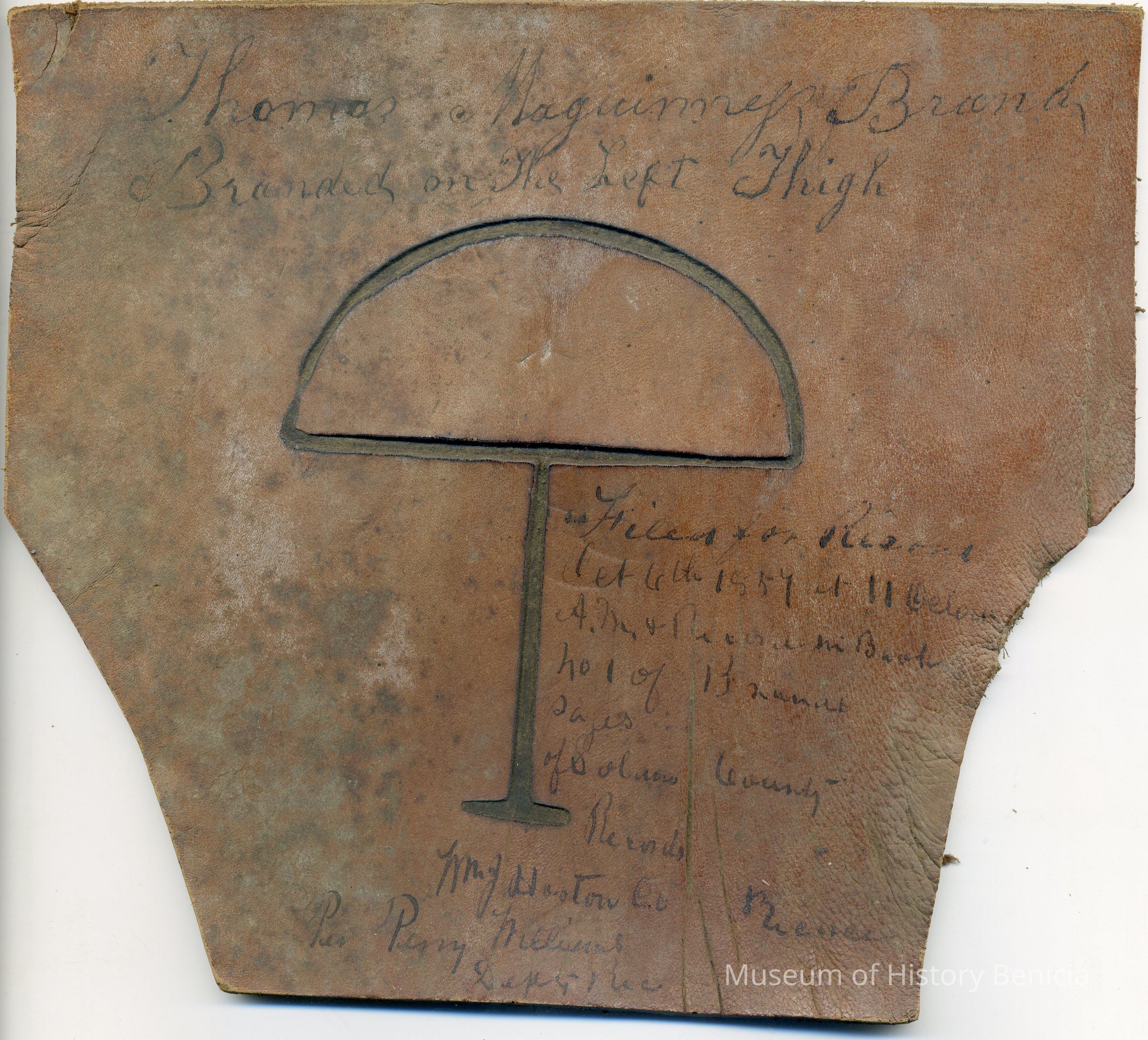 Sample brand on a piece of leather for Thomas Maguinny, registered on October 6, 1857, as written in a Ledger of the Solano County Recorder 1855-1916. (page 25)