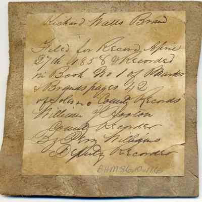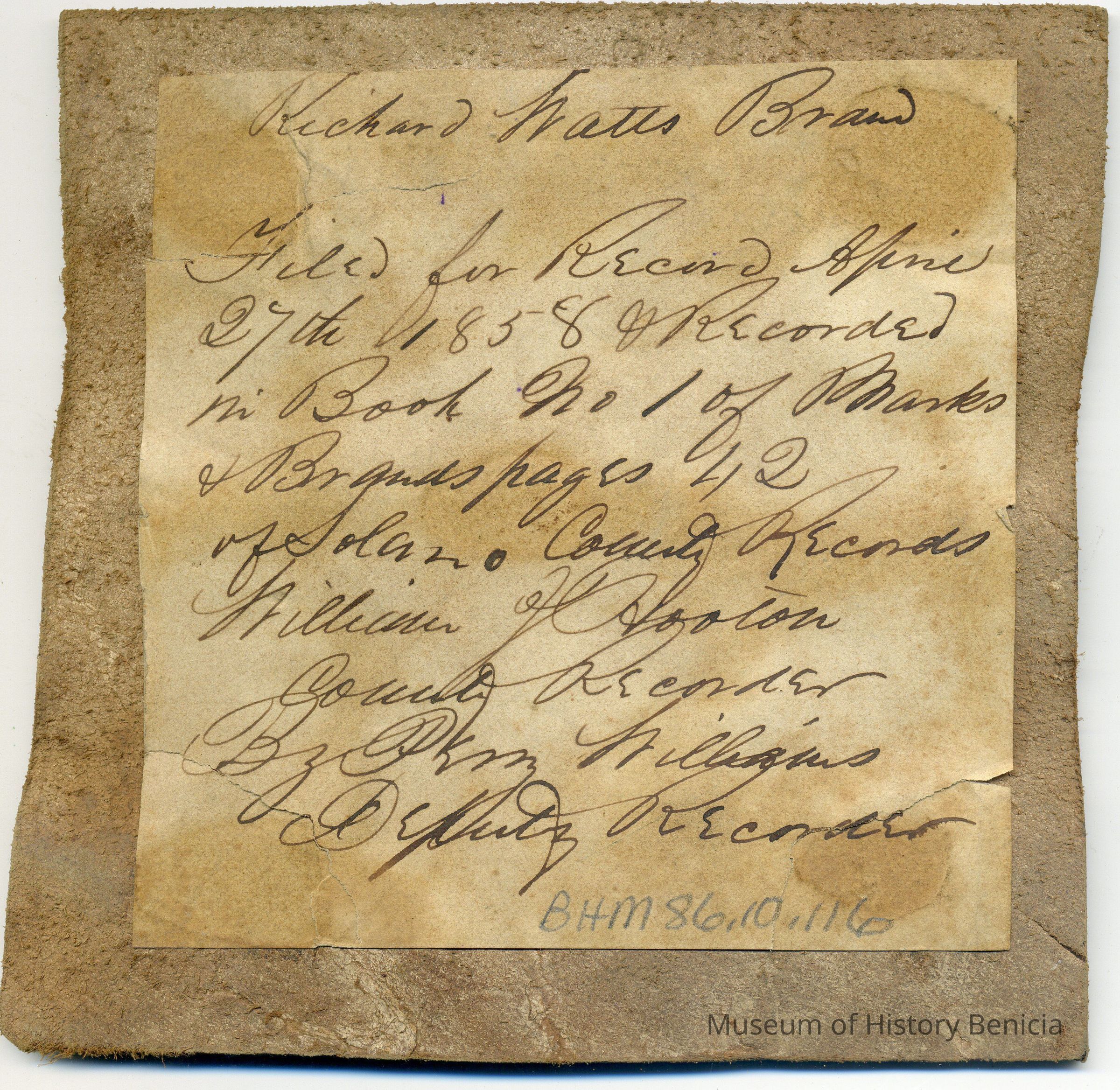 Sample brand on a piece of leather for Richard Watt, registered on April 27, 1858, as written in a Ledger of the Solano County Recorder 1855-1916. (page 42)