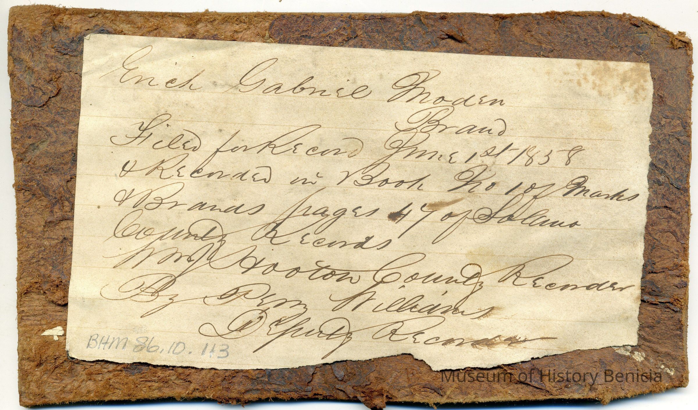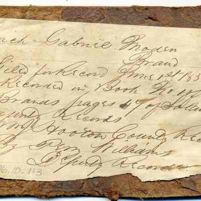 Sample brand on a piece of leather for Erick Gabriel Moden, registered on June 1, 1858, as written in a Ledger of the Solano County Recorder 1855-1916. (page 47)