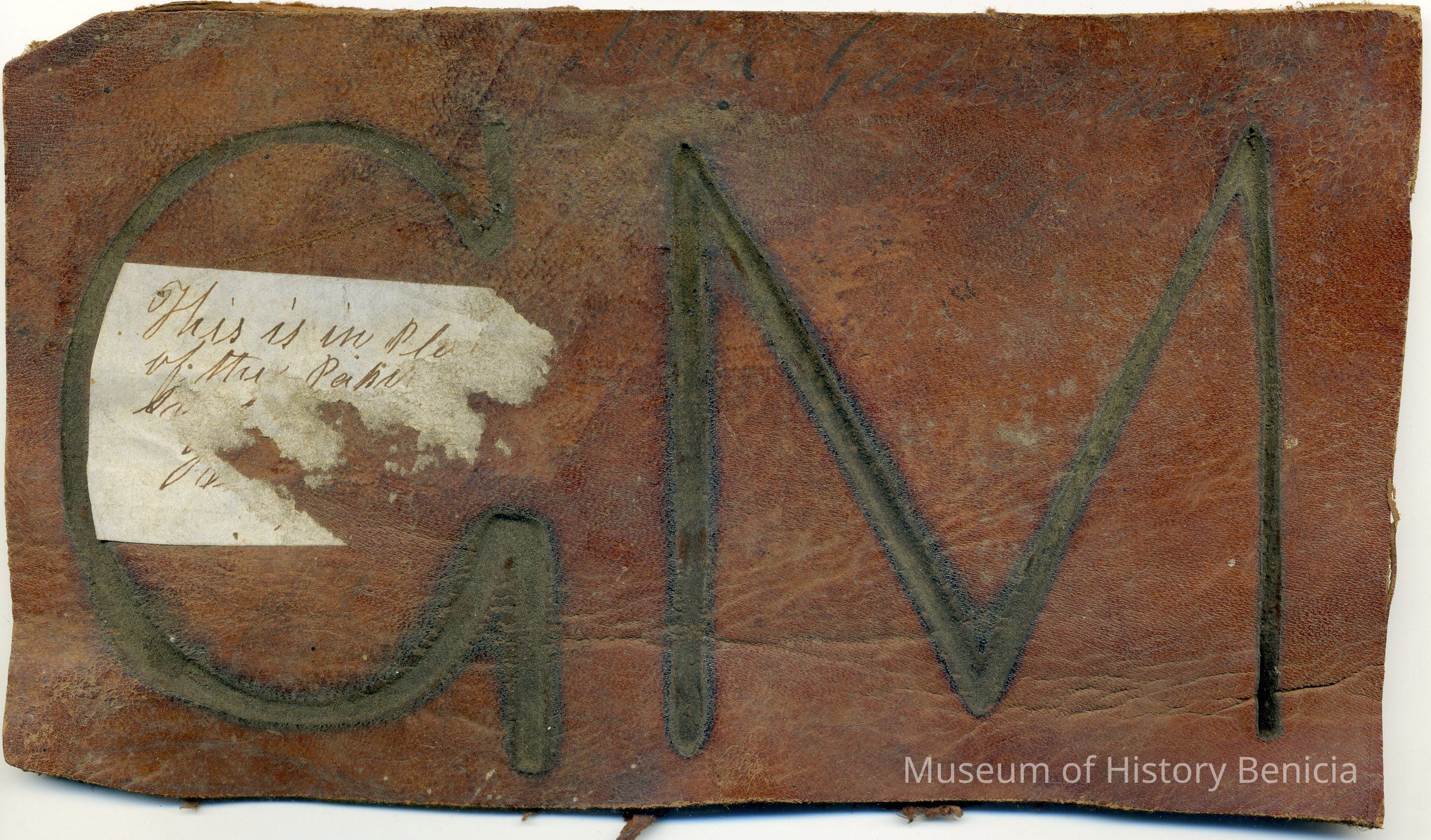 A copy of the original recording is adhered to the back of the leather. The brand is "G M" but no placement is noted.Collection
