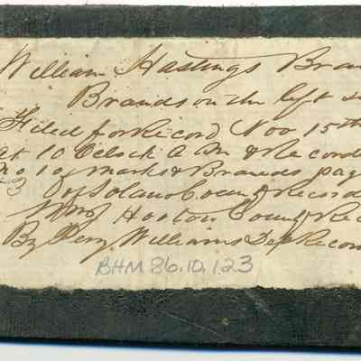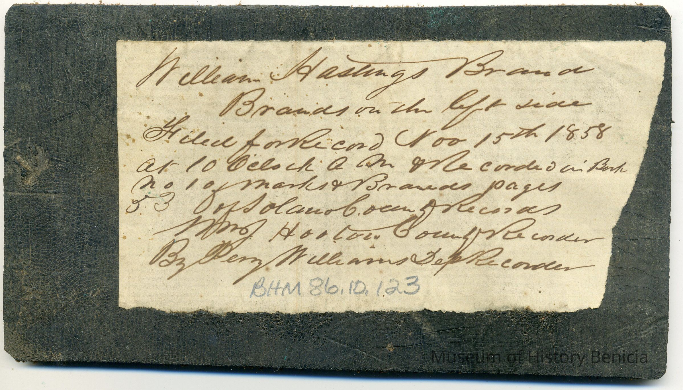Sample brand on a piece of leather for William Hastings, registered on November 15, 1858, as written in a Ledger of the Solano County Recorder 1855-1916. (page 53)