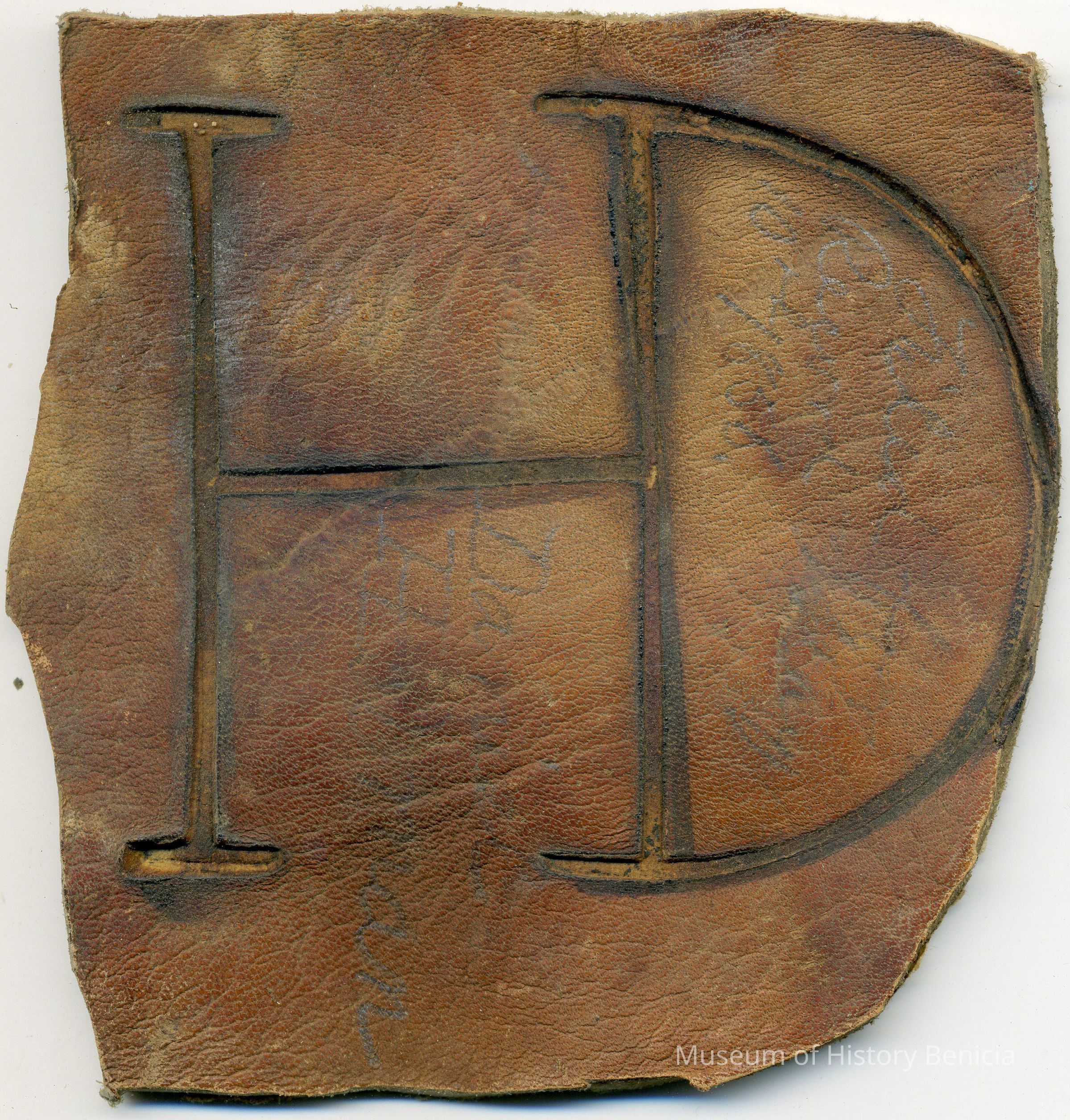Sample brand on a piece of leather for Daniel Holman, registered on May 10, 1856, as written in a Ledger of the Solano County Recorder 1855-1916. (page 5)