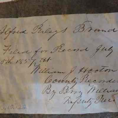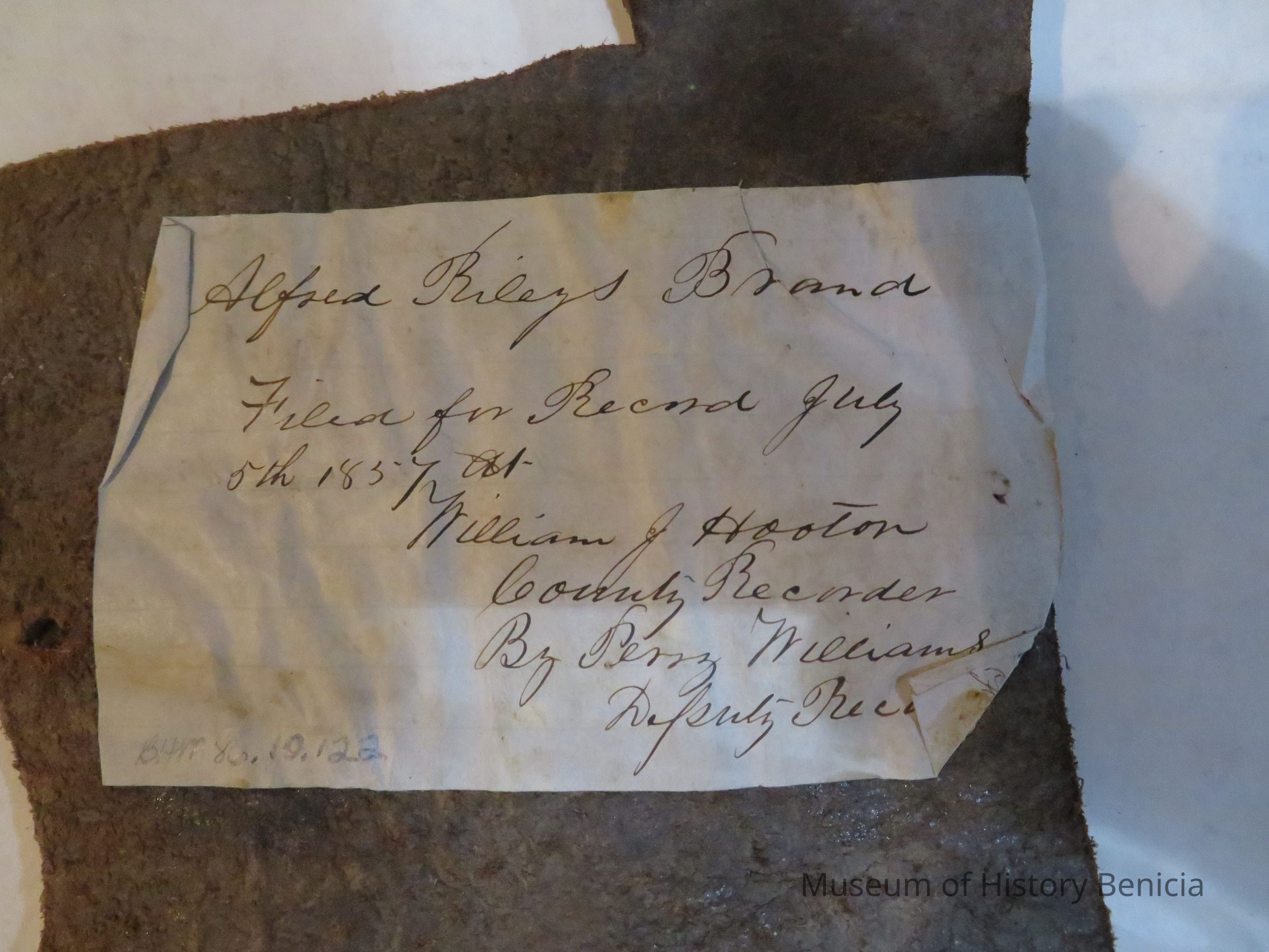 Sample brand on a piece of leather for Alfred Riley, registered on July 5, 1857, as written in a Ledger of the Solano County Recorder 1855-1916. (page 22)