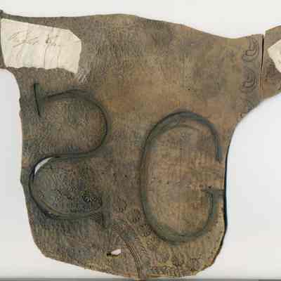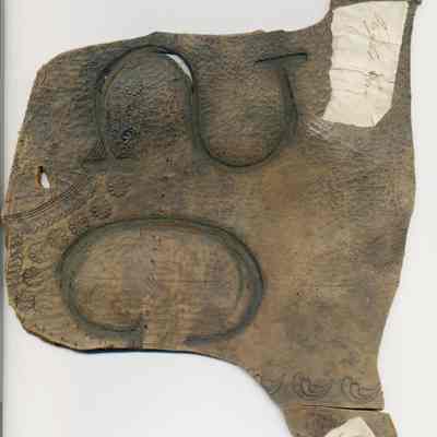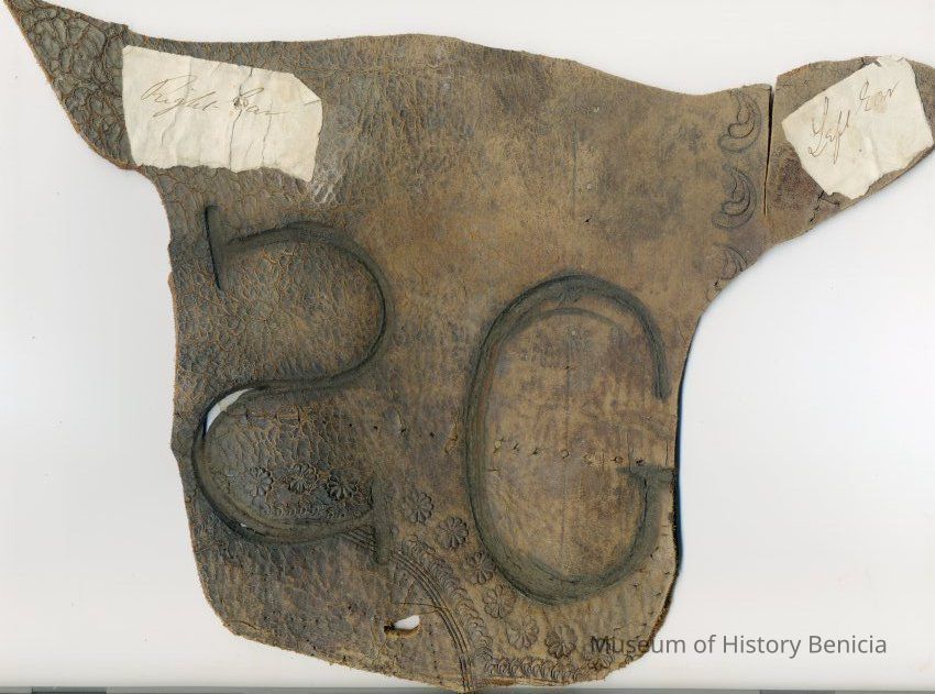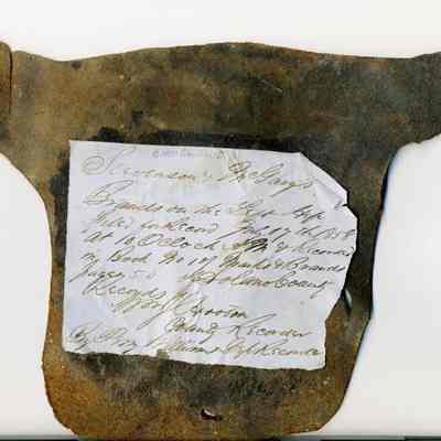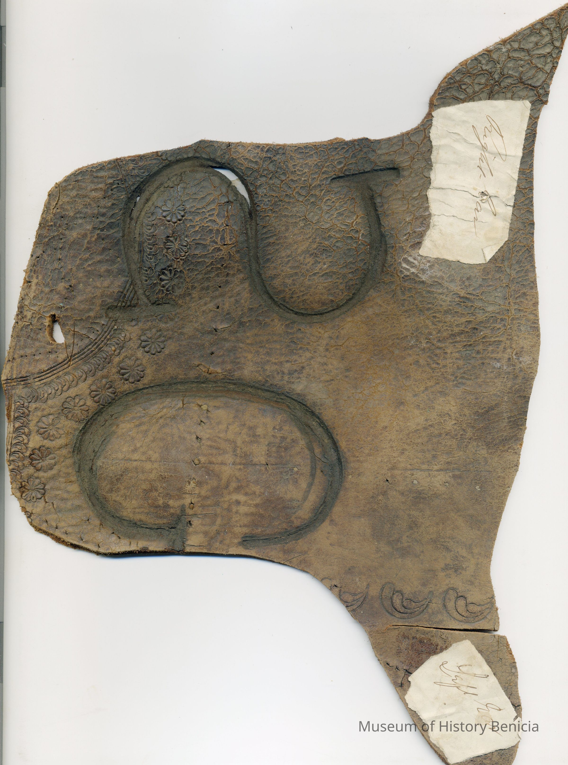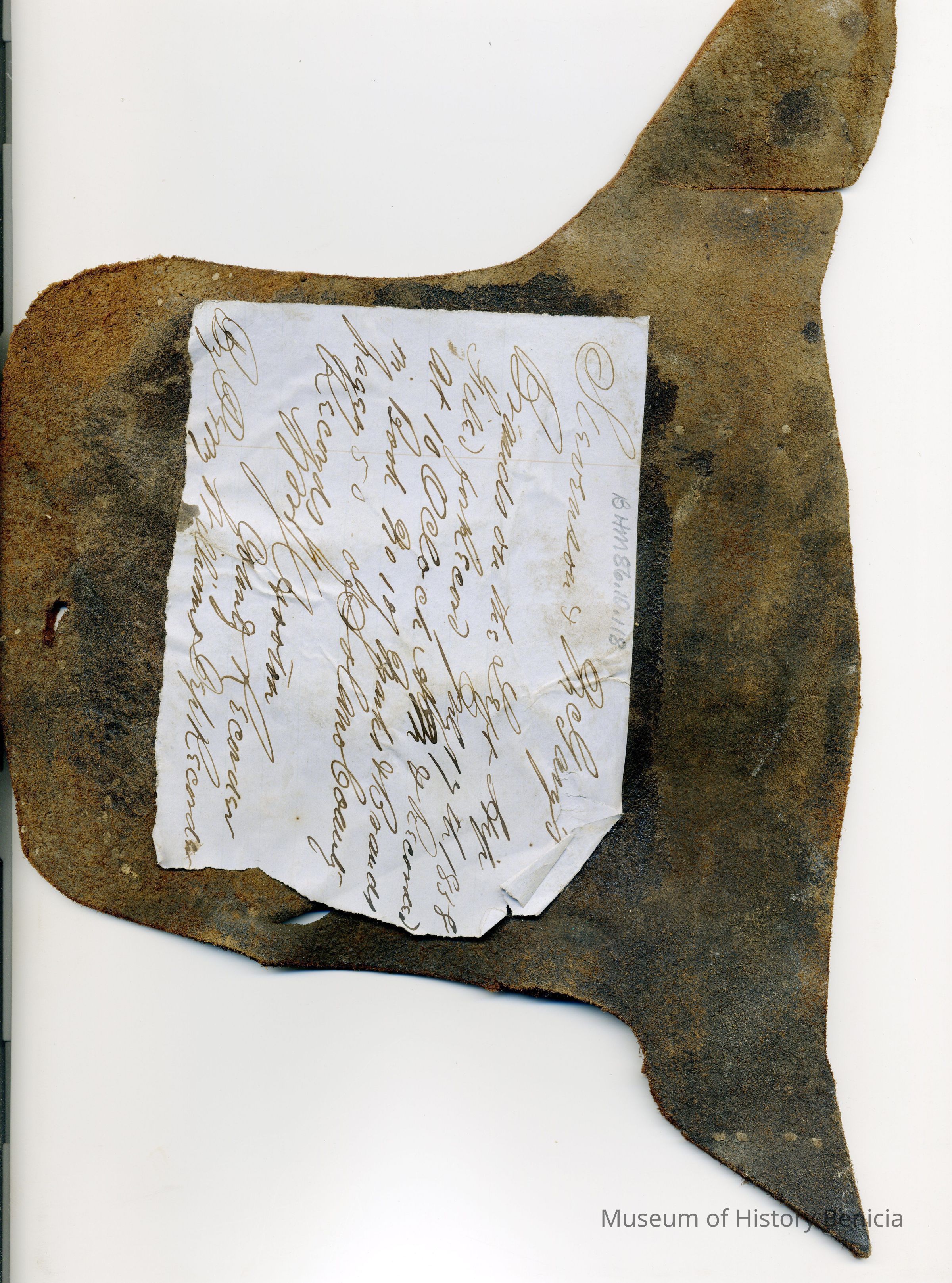A copy of the original recording is adhered to the back of the leather along with small pieces of paper with earmarking information attached to the front of the piece. The brand is a backwards capital "S" on the left and a "G" on the right and placed on the left hip.