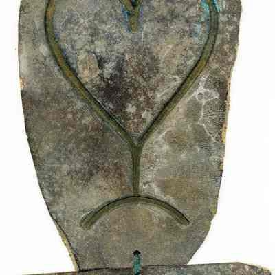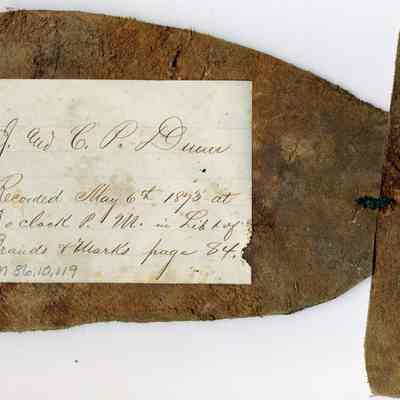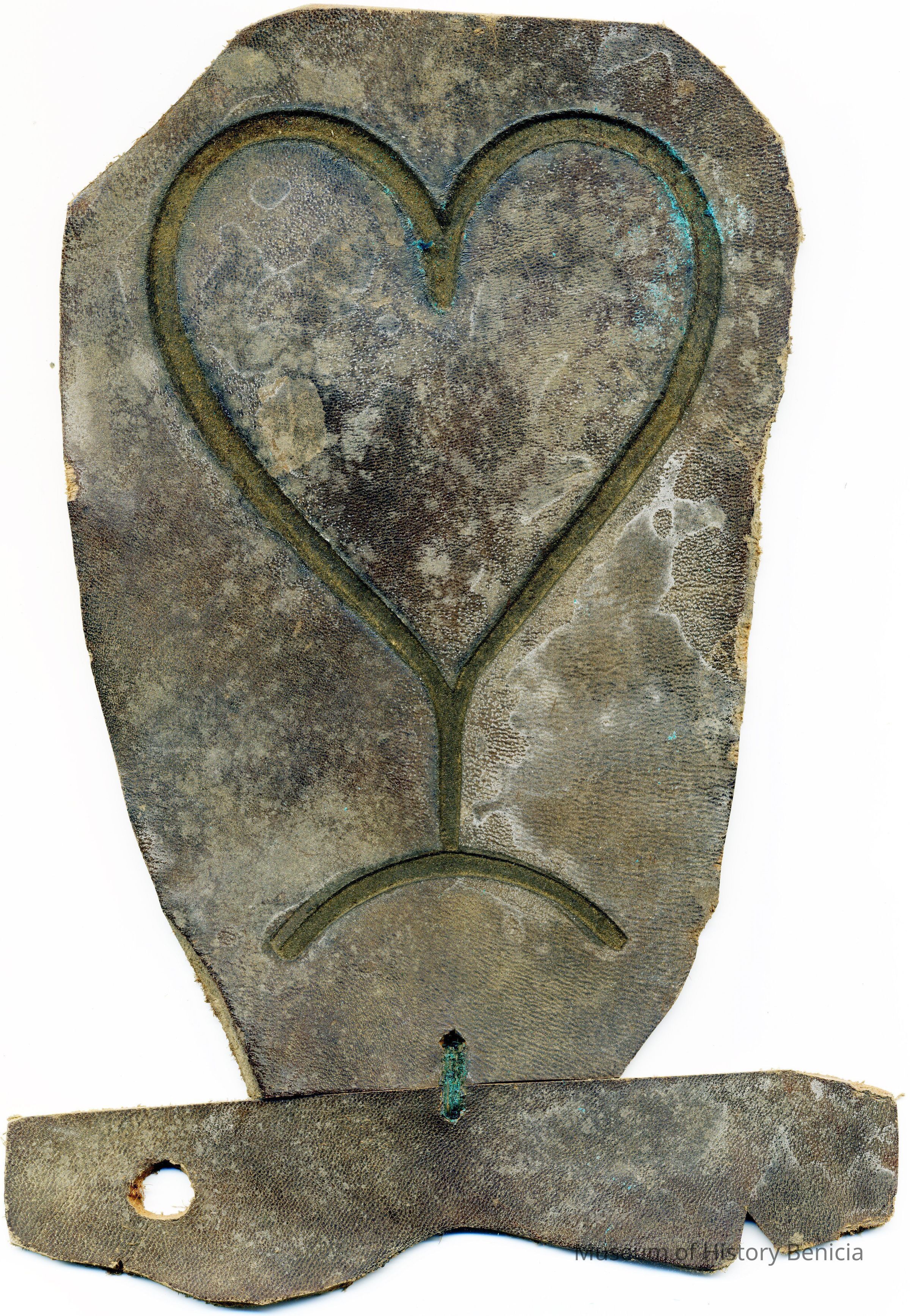 A partial copy of the original recording is adhered to the back of the leather. The brand is a heart with a short arcing line attached to the bottom of the heart with a short line. A separate piece of leather is attached to the larger piece with twine to show the earmarkings.Collection
