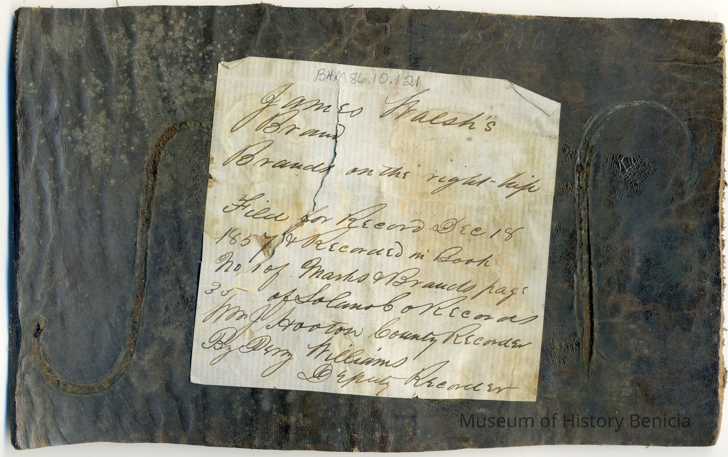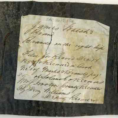 A copy of the original recording is adhered to the back of the leather. The brand is a capital "J" on the left and a "wavy W" on the right. The placement is on the right hip.Collection