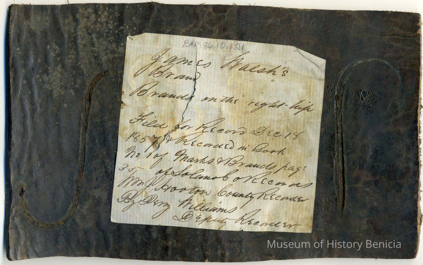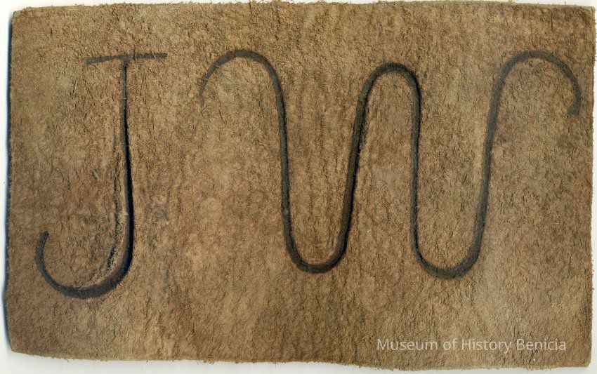 Sample brand on a piece of leather for James Walsh, registered on December 18, 1857, as written in a Ledger of the Solano County Recorder 1855-1916. (page 35)