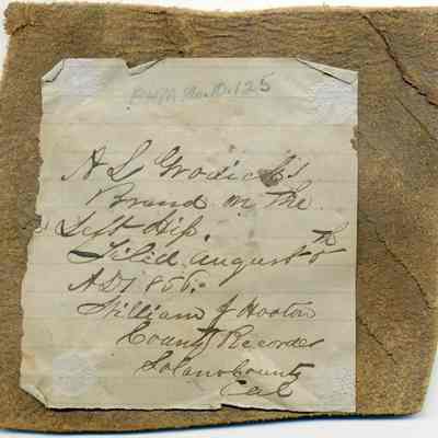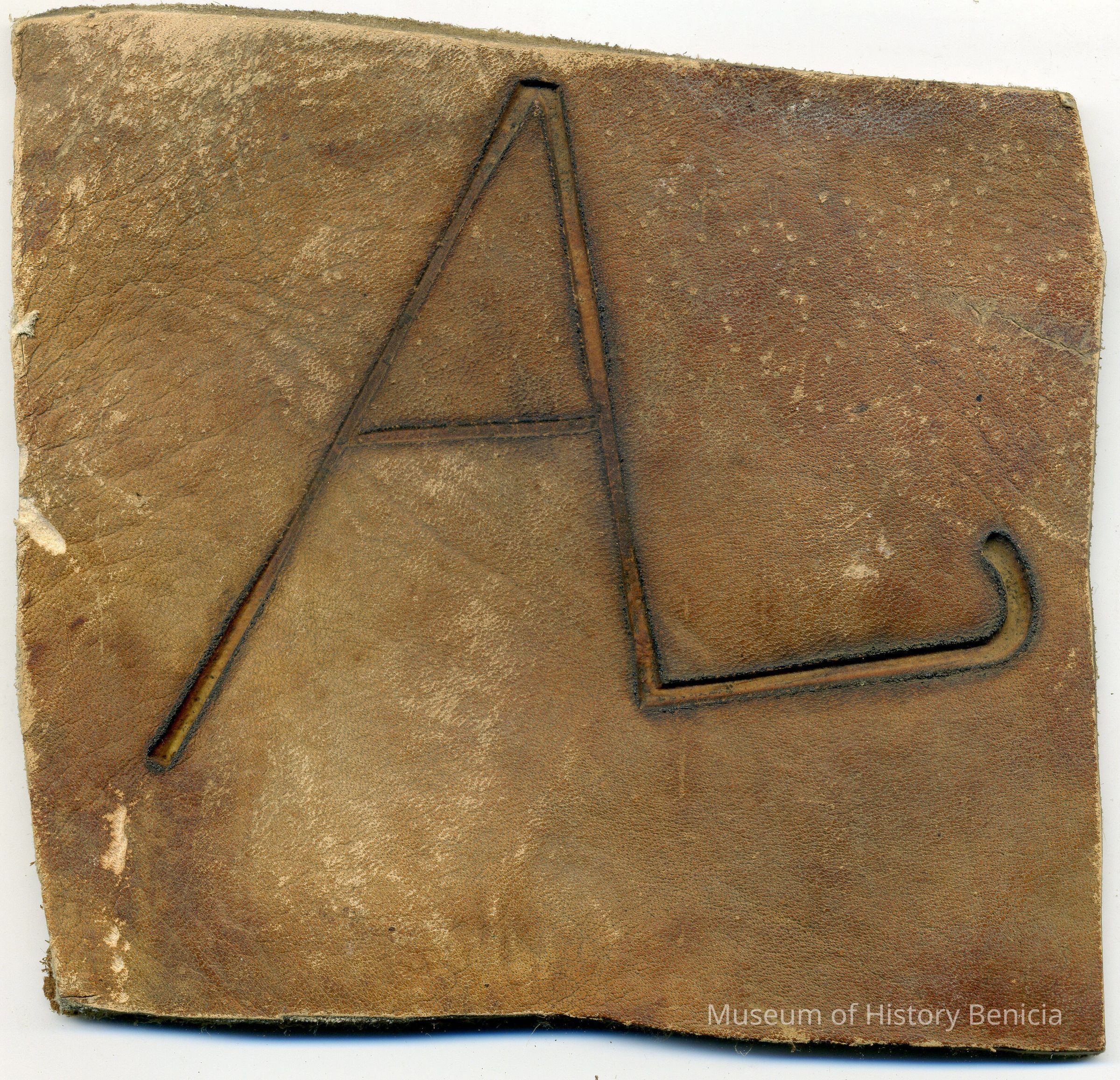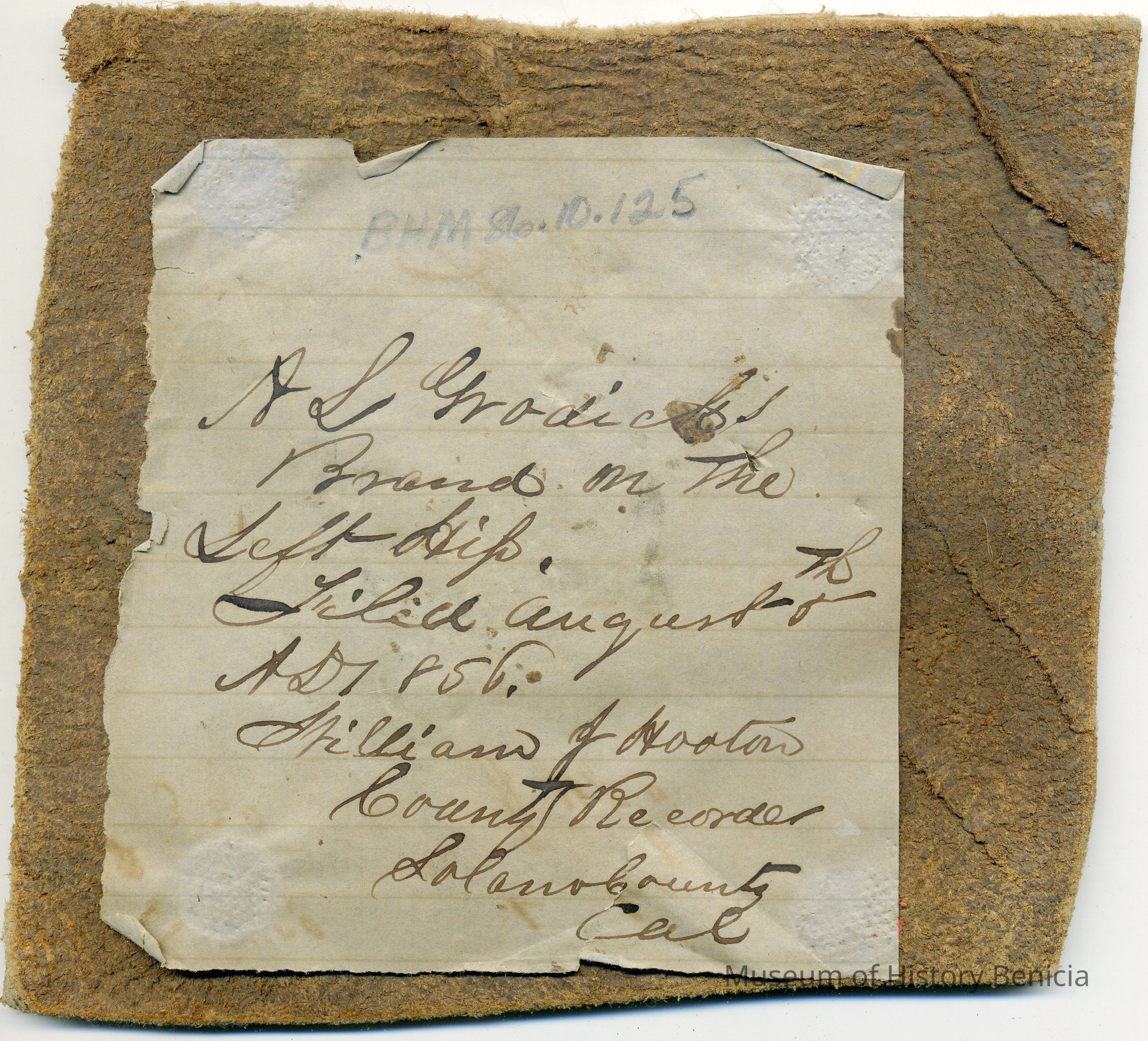 Sample brand on a piece of leather for A.L. Grodick, registered on July 8, 1856, as written in a Ledger of the Solano County Recorder 1855-1916. (page 7)