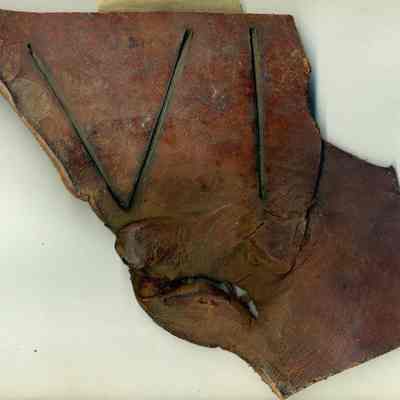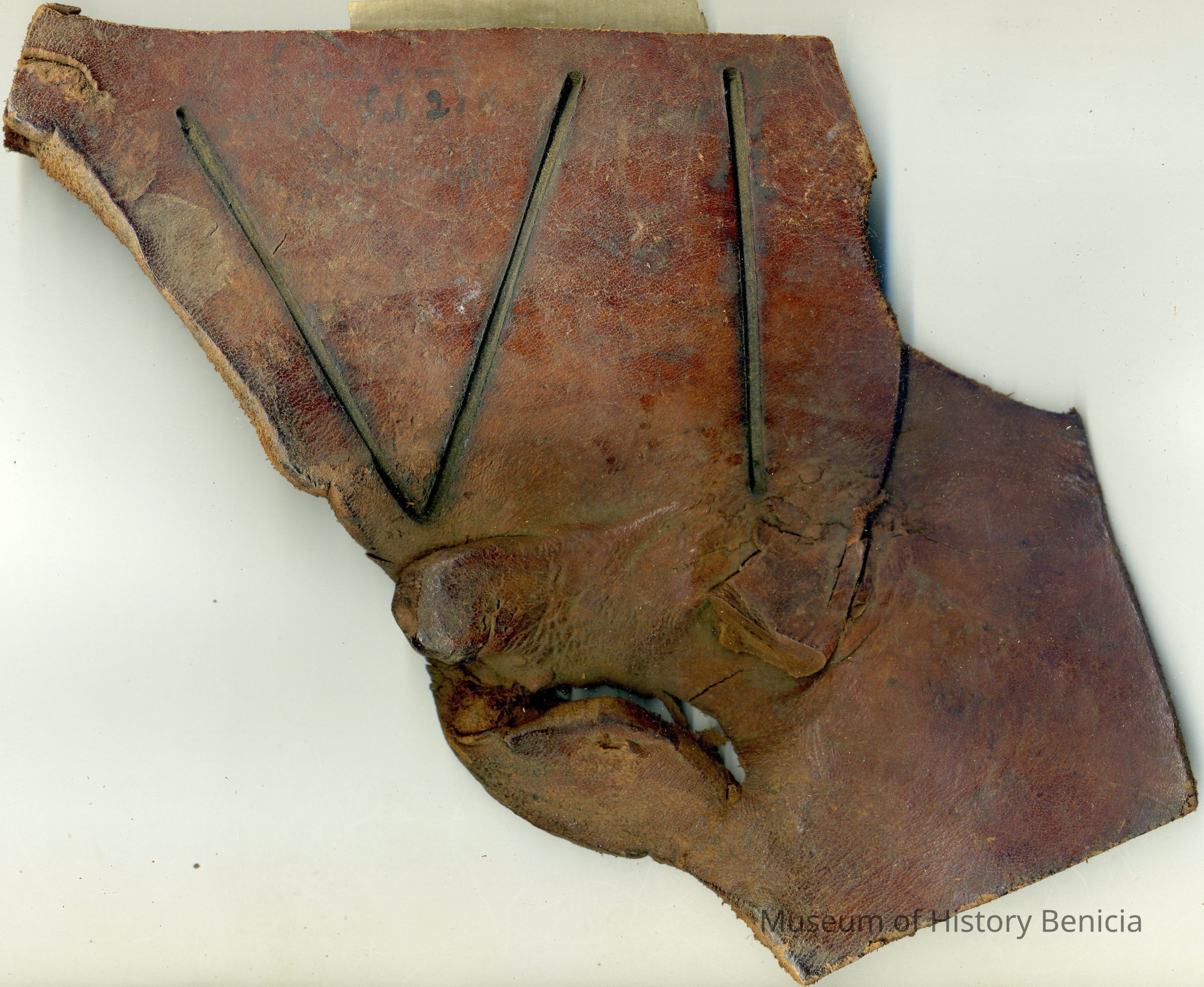 A partial copy of the original recording (edges are torn) is adhered to the back of the leather. The brand is "V I" and placed on the right side. The leather piece is slightly twisted but very stiff.Collection