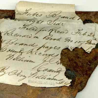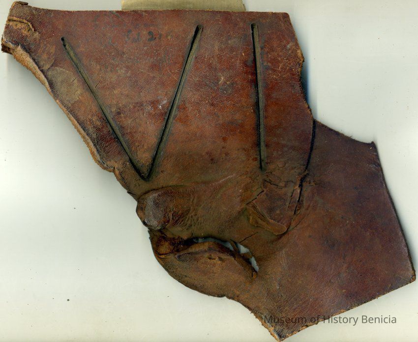 Sample brand on a piece of leather for Charles Forbes, registered on February 20, 1858, as written in a Ledger of the Solano County Recorder 1855-1916. (page 38)