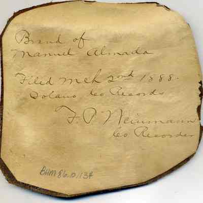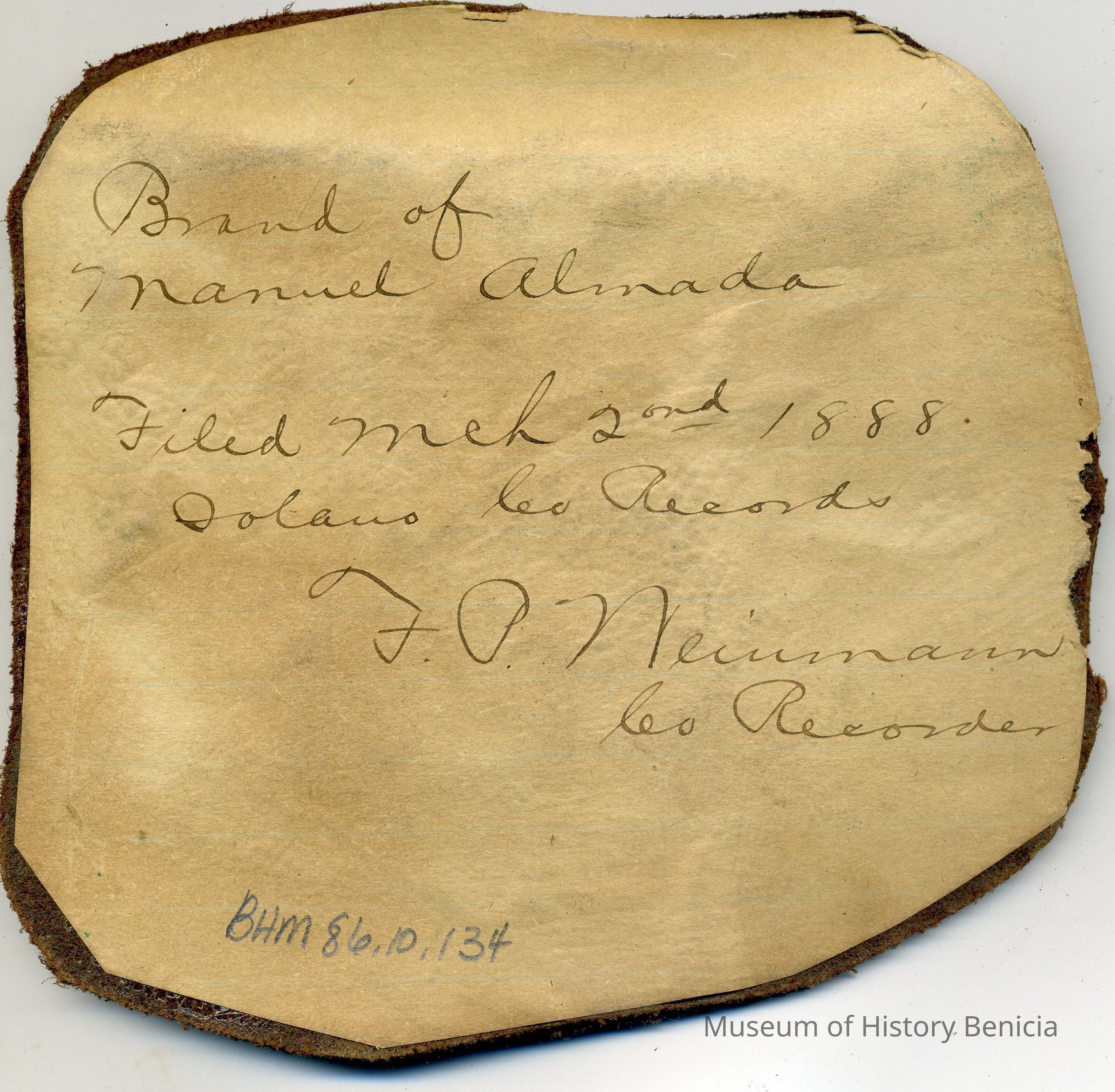 Sample brand on a piece of leather for Manuel Almada, registered on March 2, 1888, as written in a Ledger of the Solano County Recorder 1855-1916. (page 99)