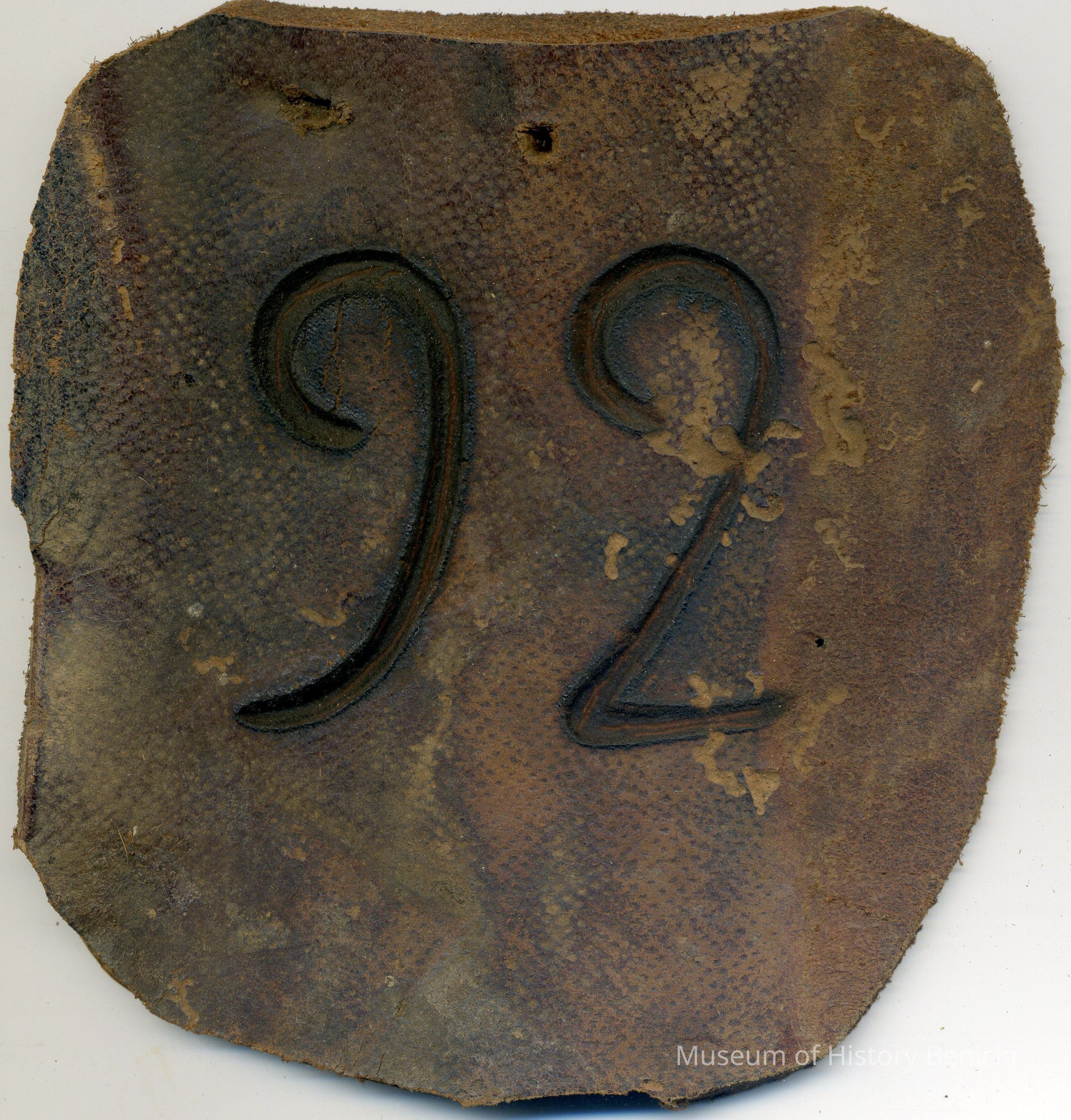A partial copy of the original recording is adhered to the back of the leather. The brand is "9 2" and no placement is noted.Collection