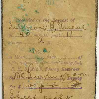 A partial copy of a ditto reproduced recording is adhered to the back of the leather. The brand is "F G" and placed on the right side of the individual's sheep. A $1.00 fee was paid.Collection