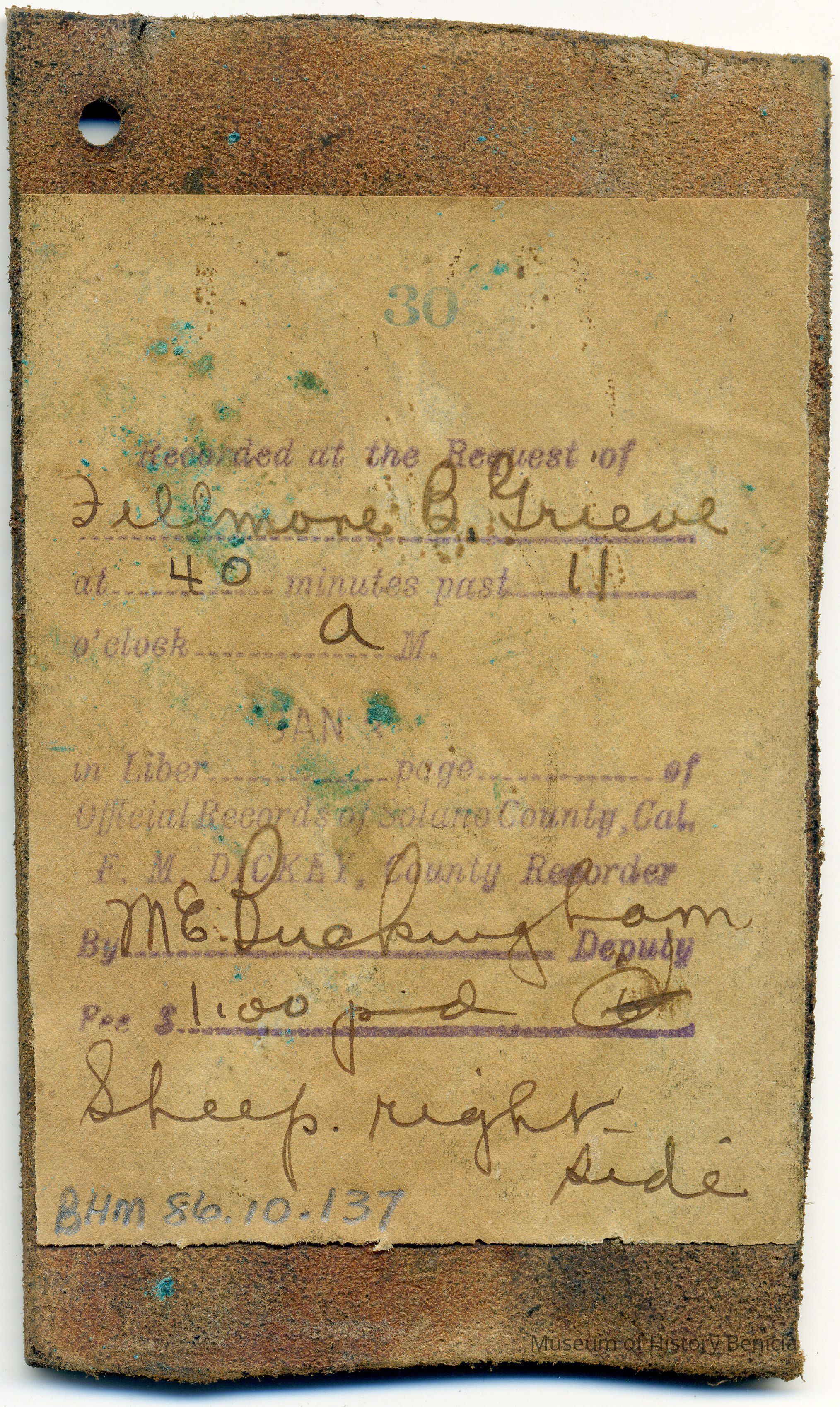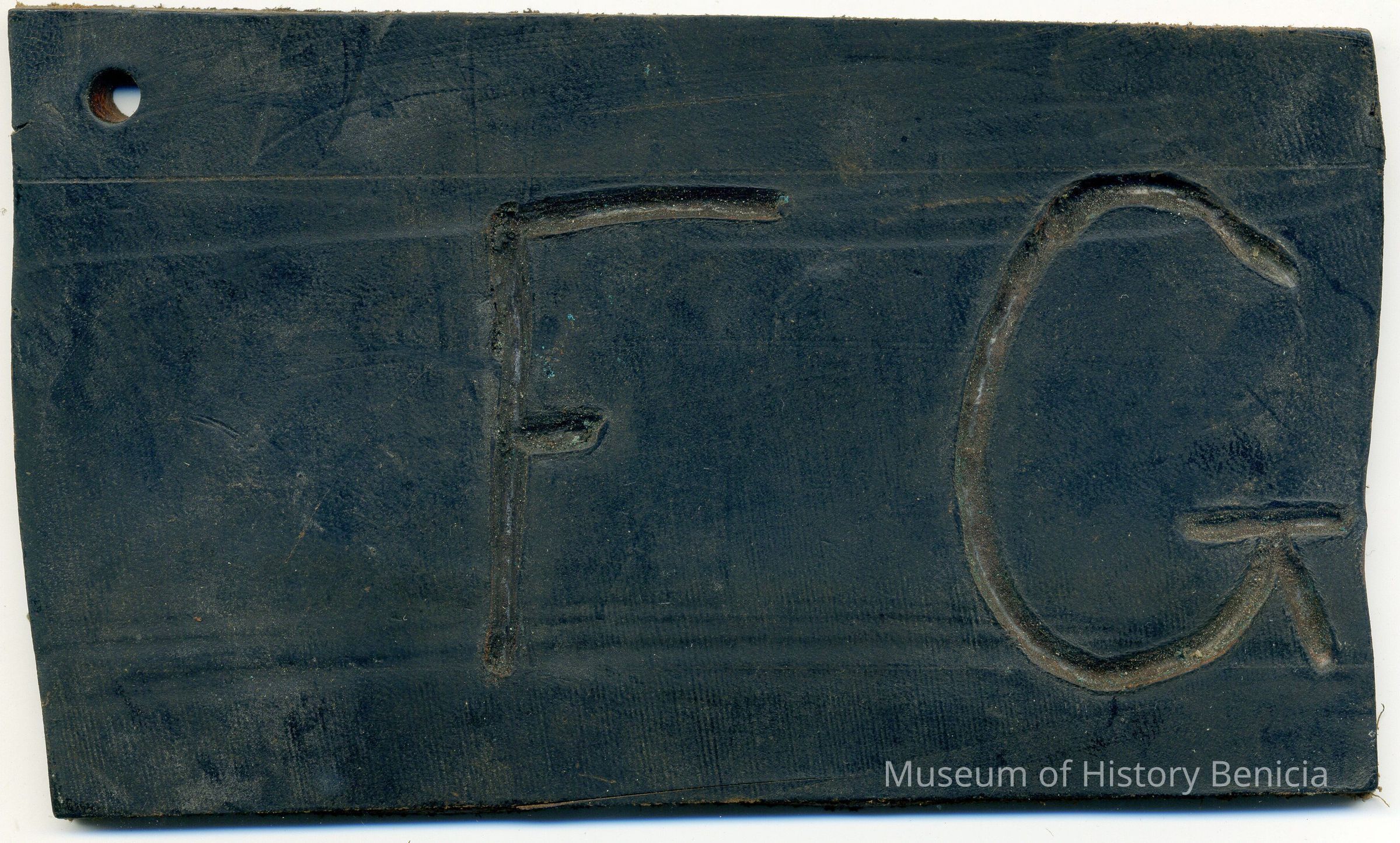 Sample brand on a piece of leather for Fillmore B. Grieve, registered in January of an unindicated year at 40 minutes past 11:00AM, and is not written in a Ledger of the Solano County Recorder 1855-1916.