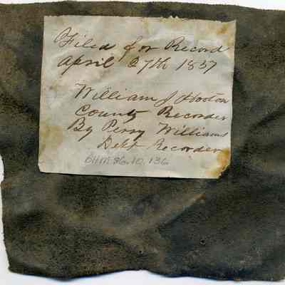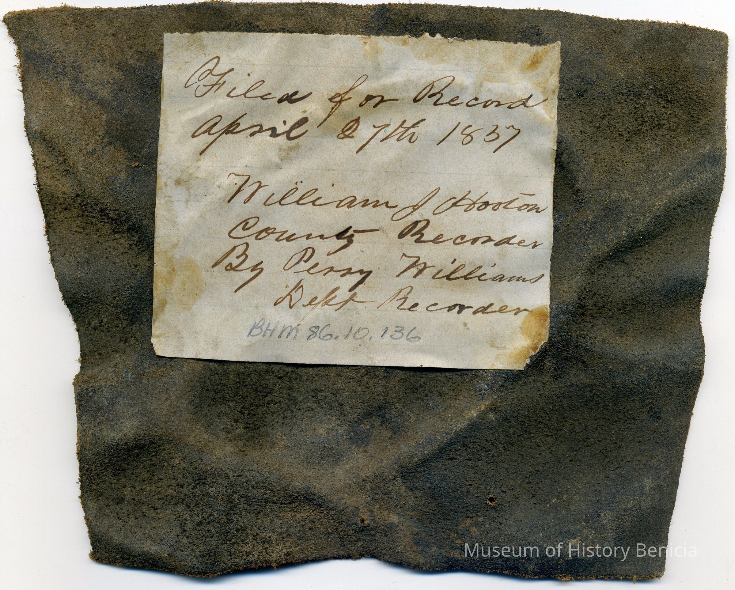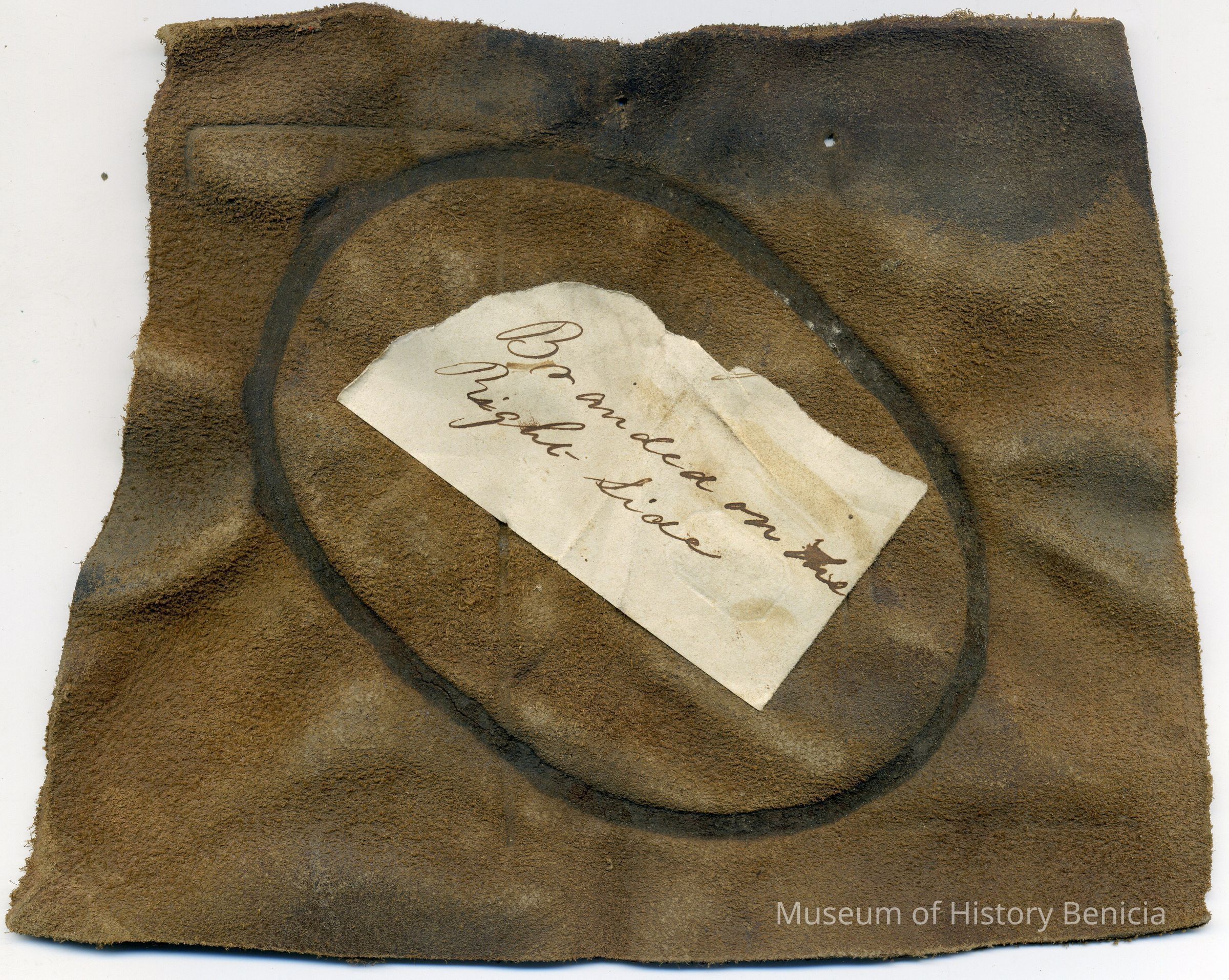 A partial copy of a recording is adhered to the back of the leather and a piece of paper with the placement is adhered to the front, inside the brand. The brand is an oval and is placed on the right side.Collection