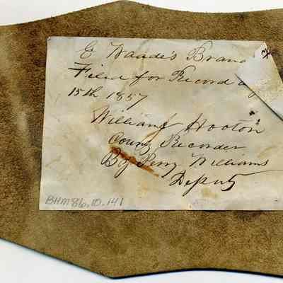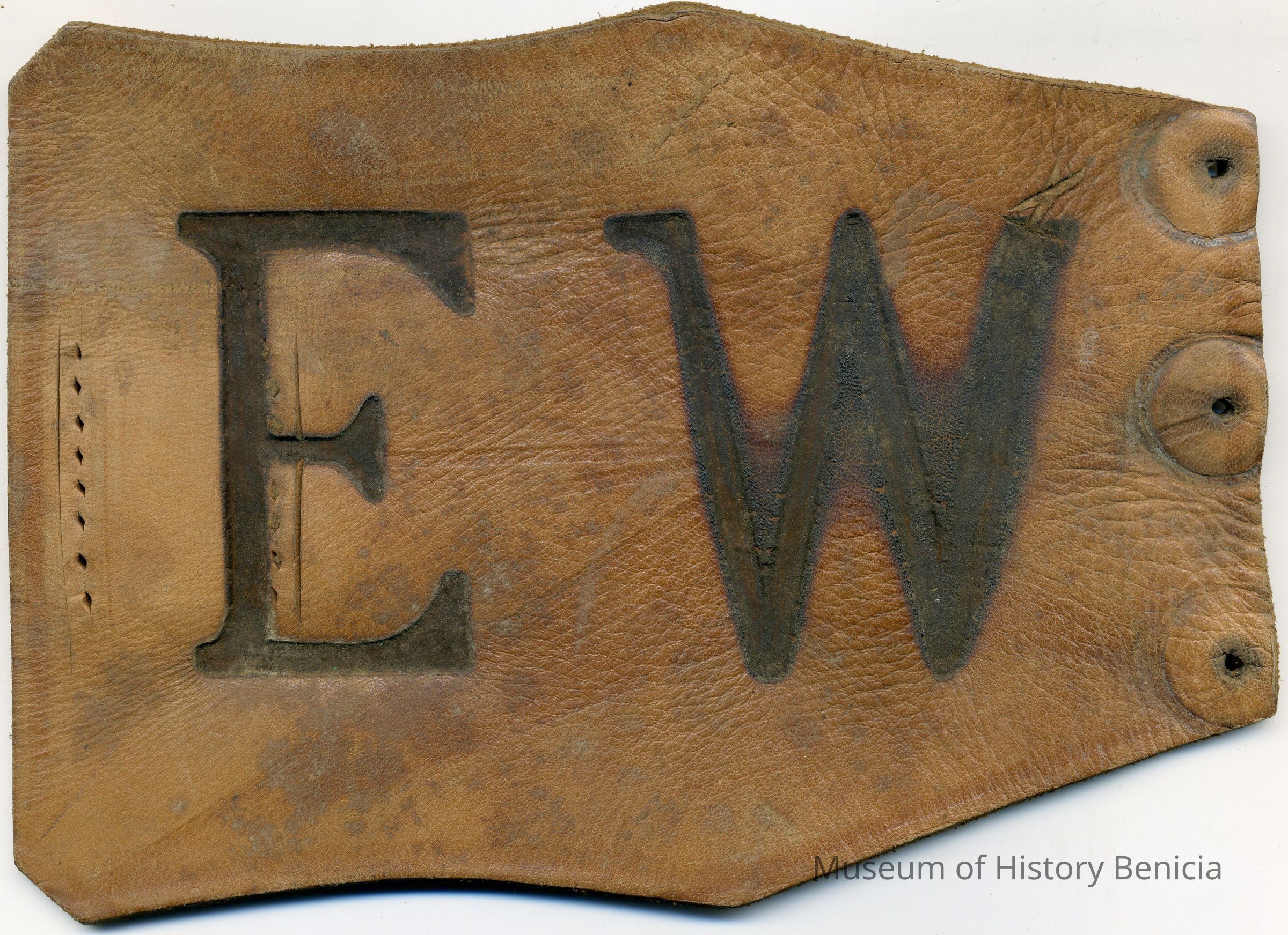 A partial copy of a recording is adhered to the back of the leather. The brand is "E W" and placed on the right hip. [There are three holes punched on the right side which appear to be from something used to attached the leather piece to another object.]Collection