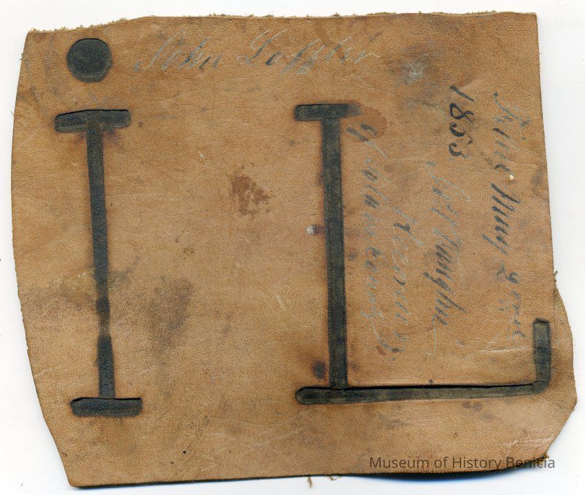 Sample brand on a piece of leather for John Loffler (?), registered in May 1853, and is not written in a Ledger of the Solano County Recorder 1855-1916.