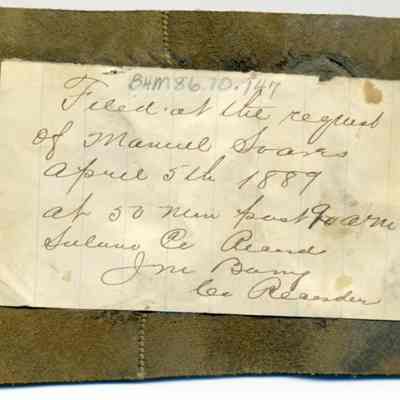 Sample brand on a piece of leather for Manuel Soares, registered on April 5, 1889, as written in a Ledger of the Solano County Recorder 1855-1916. (page 100)