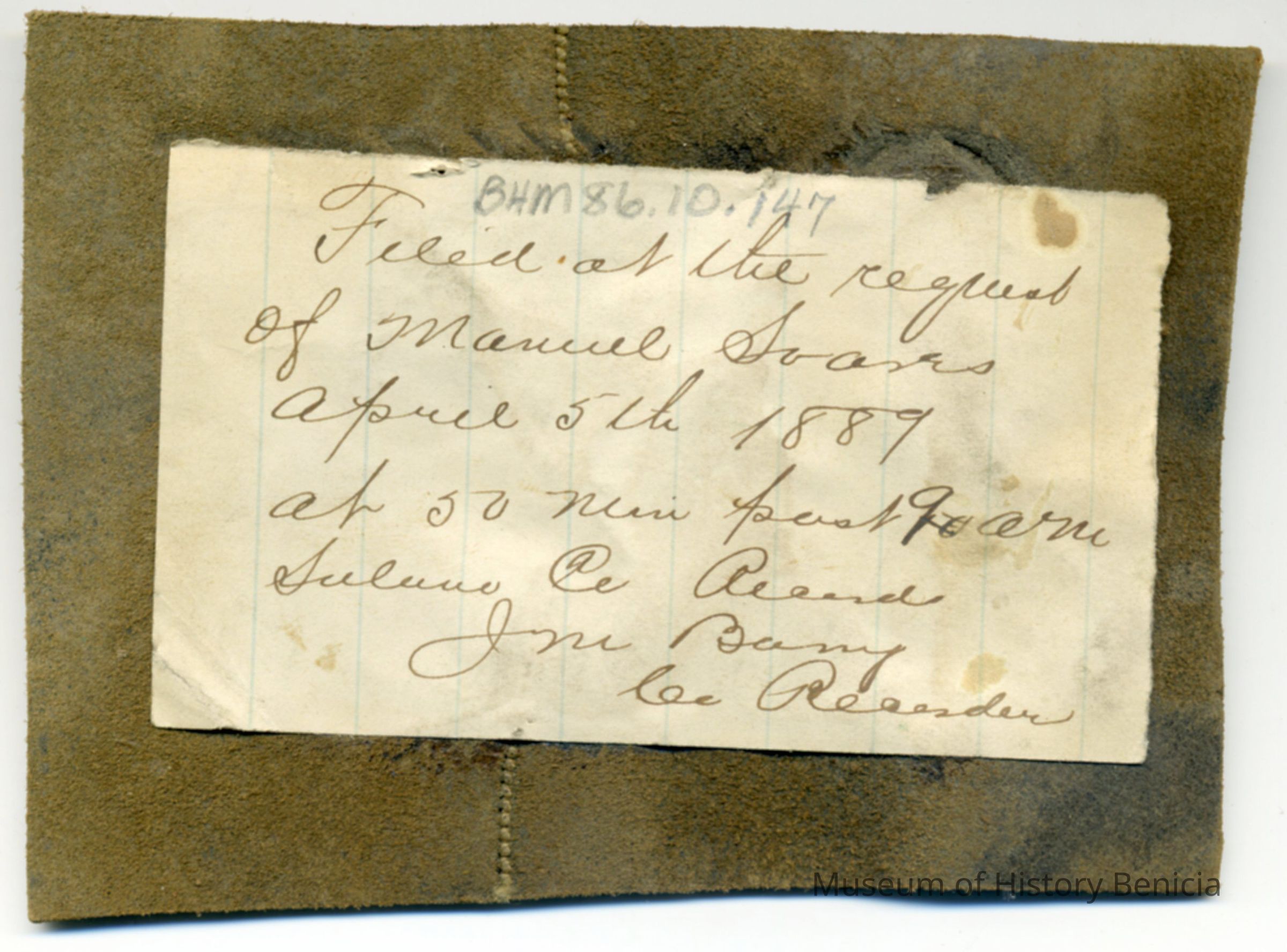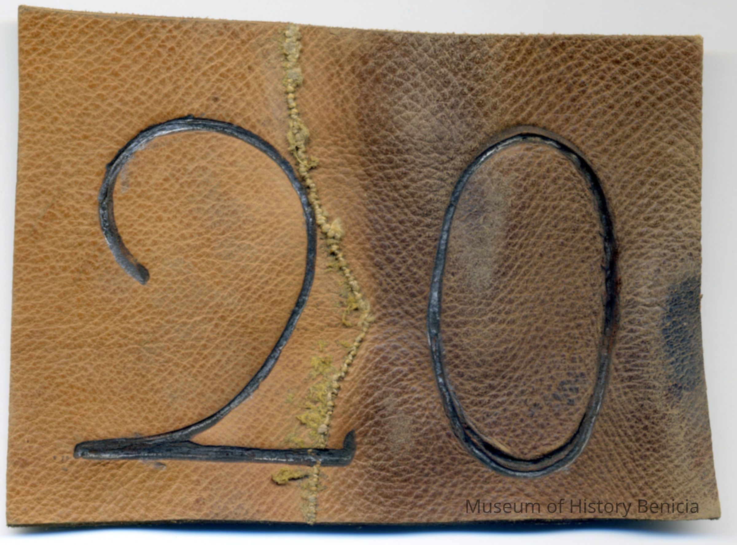 A partial copy of a recording is adhered to the back of the leather. The brand is "2 0" and placement is not noted.Collection