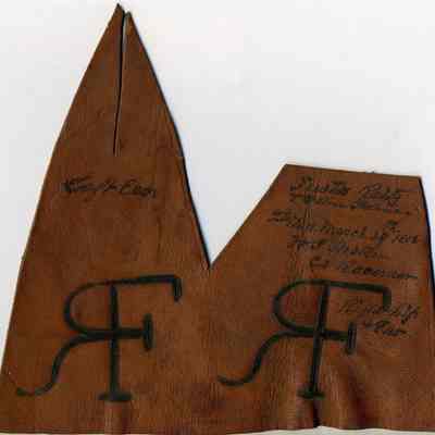 No copy of a recording is adhered to the back of the leather, however some information is written in ink on the front of the leather piece. The brand is a backwards capital R attached to the left side of a capital F but no placement is noted. The earmarking are cut into ear shaped on the top side of the piece of leather.Collection
