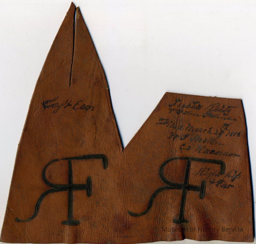 Sample brand/earmarking on a piece of leather for Justis Reitz & John Haliman, registered on March 29, 1856, as written in a Ledger of the Solano County Recorder 1855-1916. (page 3)