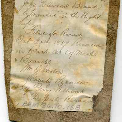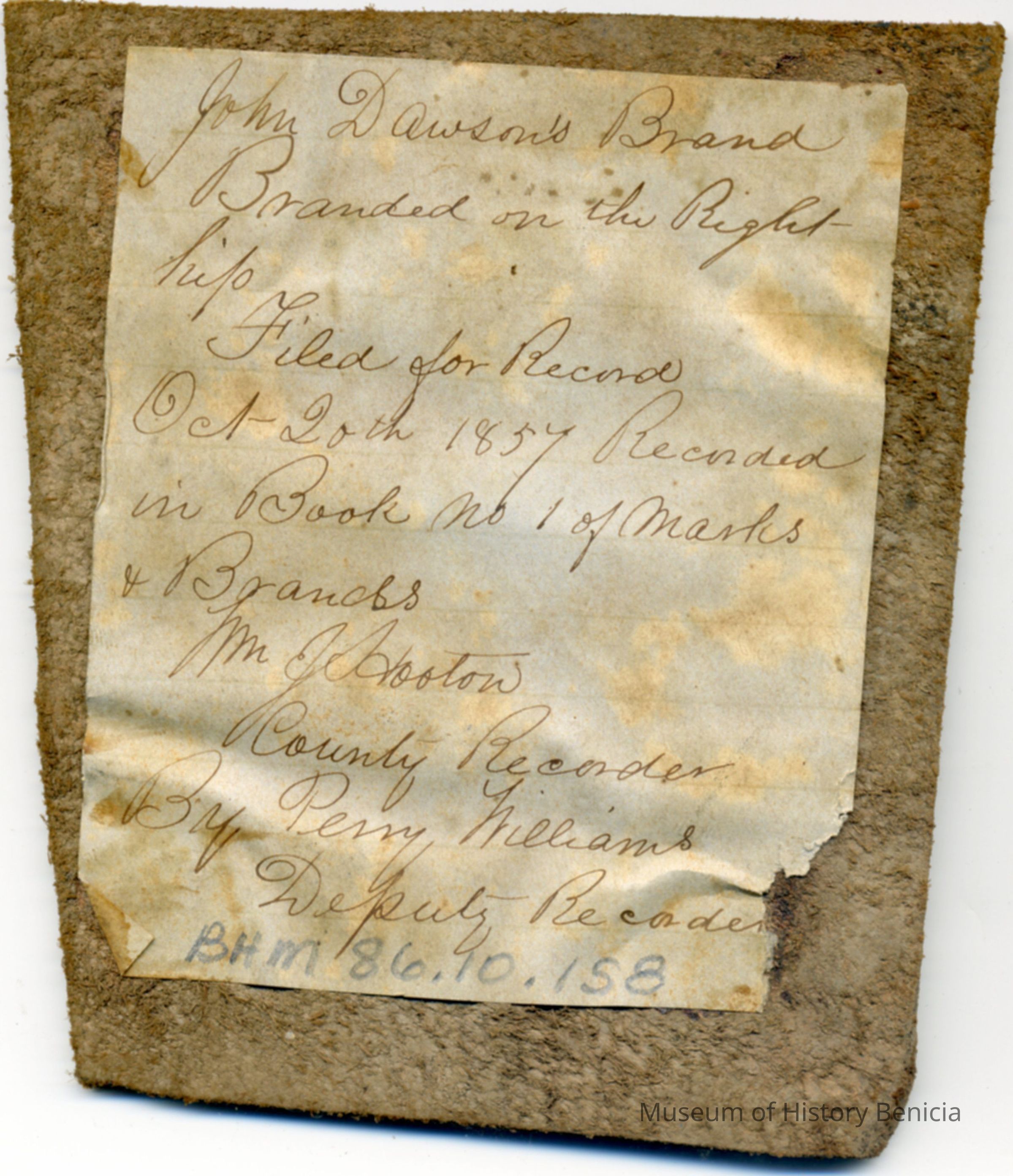 Sample brand on a piece of leather for John Dawson, registered on October 20, 1857, as written in a Ledger of the Solano County Recorder 1855-1916. (page 28)