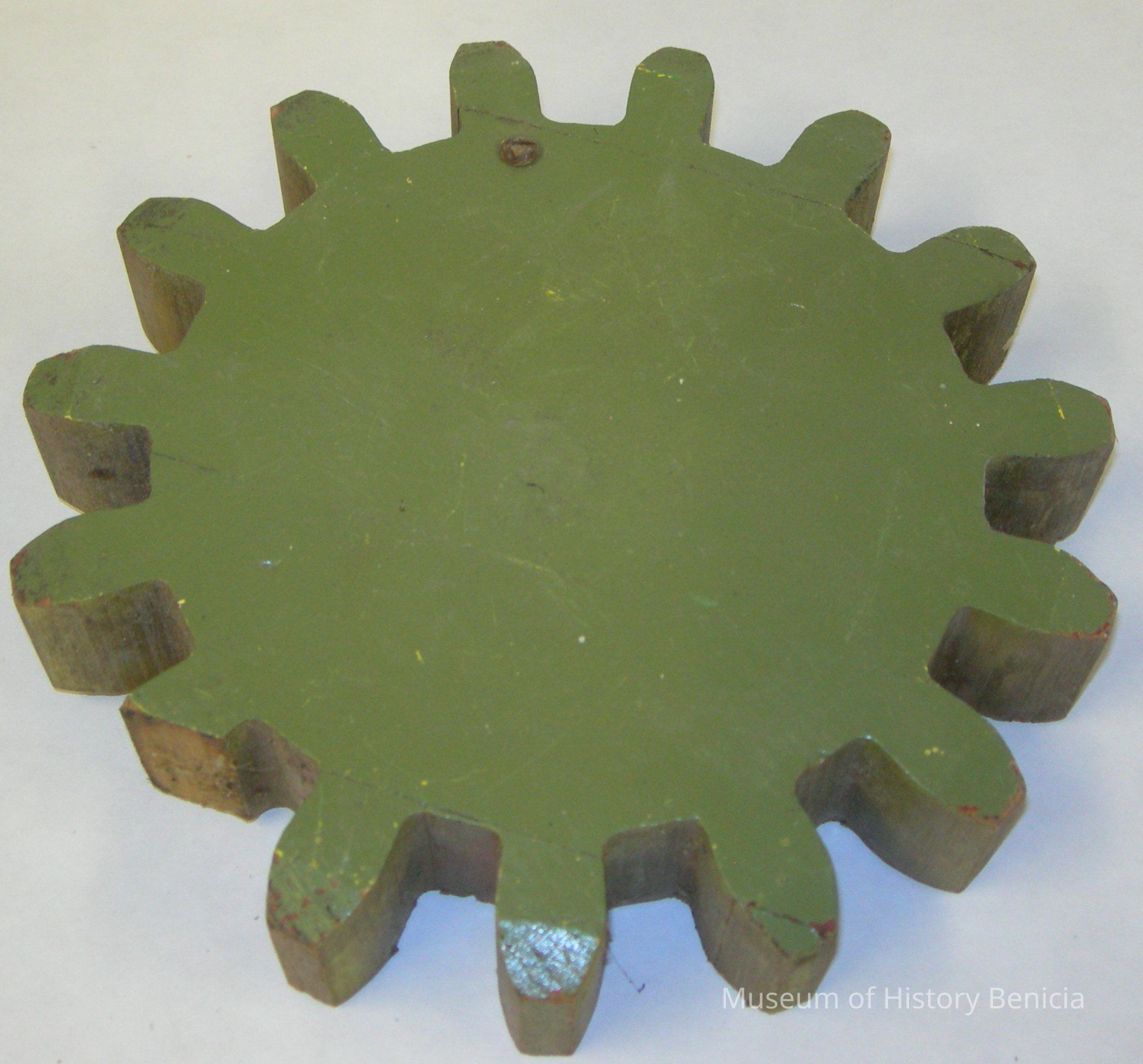 Yuba Mtg. Co. Gear shaped, wooden no label one metal screw, green one side, yellow on other