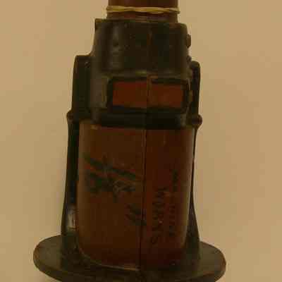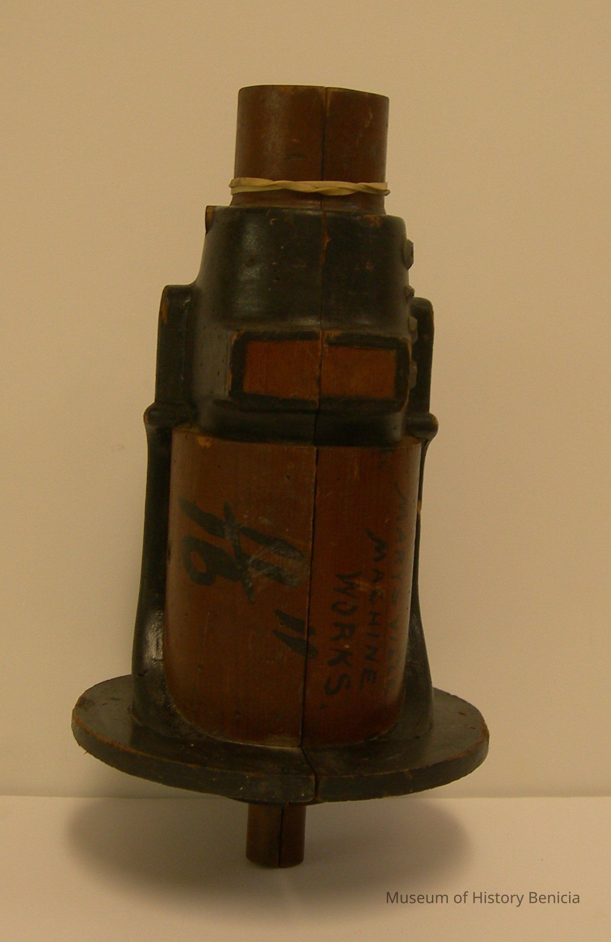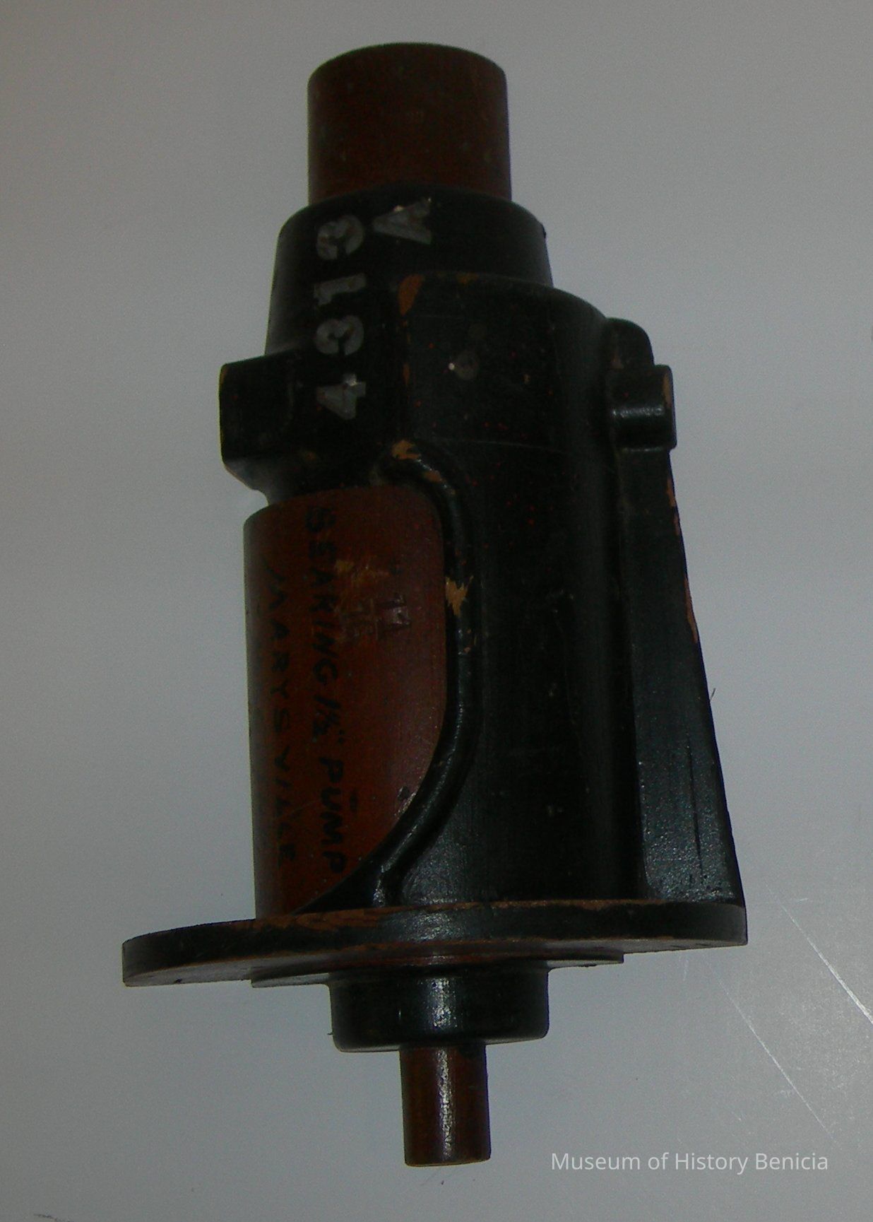 Yuba Pattern - Black/brown; multi-shaped; black lettering: "Bearing 1-1/2" Pump / Marysville / Machine Works"; stamped in: "11, 16"; individual metal numberals: "4 3 1 3 A"; has holes in back to fit companion piece; 5-1/2" wide (widest) - 3/4" wide (narrowest) x 3" deepest) - 7/8" deep (narrowest) x 10" tall.Collection