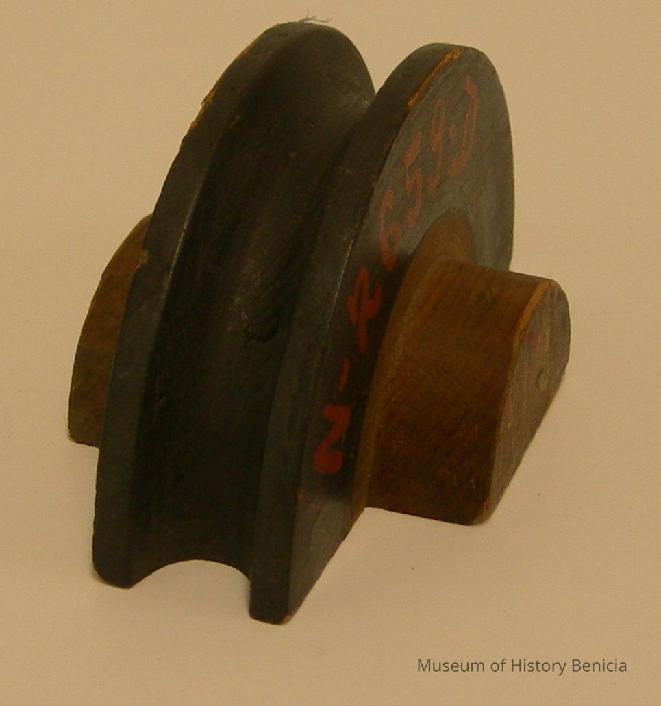 Yuba Pattern - Black/brown; red lettering: "N2659-D" and "Yuba Mfg Co / Thimble"; stamped in on the back: "N2659D" ; half-round shape; has holes in bak t fit companion piece which is not included; 2" wide x 4" long x 2-1/4" tall.Collection