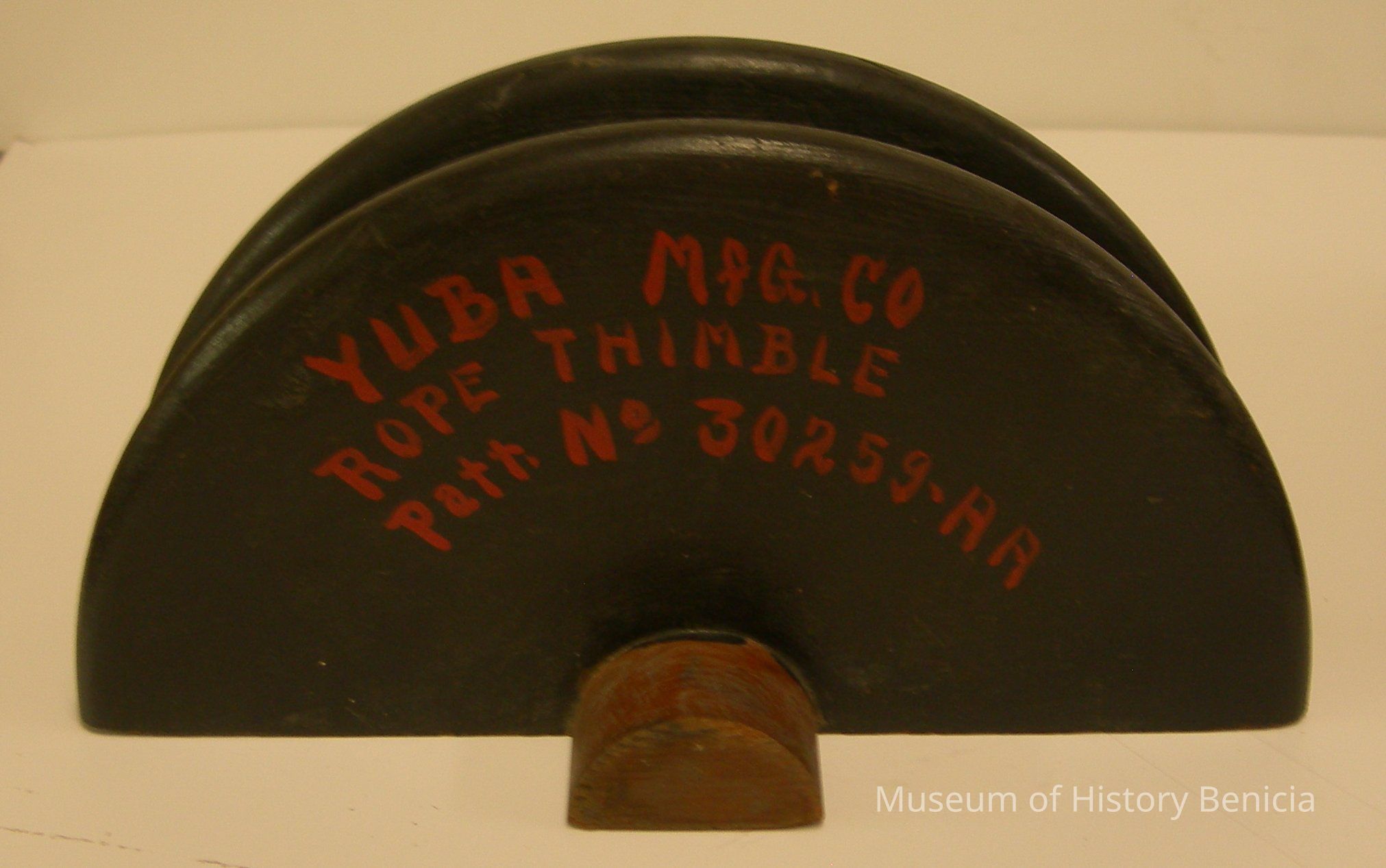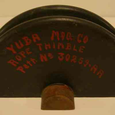 "Yuba Mfg Co. / Rope Thimble / Patt No 30259-AA"; stamped in on back "30259AA" "3"; has holes in back to fit companion piece; 4-1/2" wide x 9" long x 5" tall; 2-1/2" edge is ridged.Collection