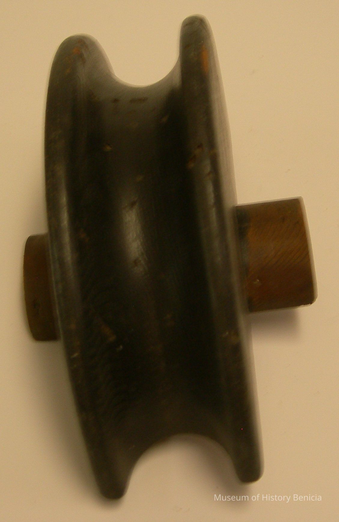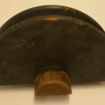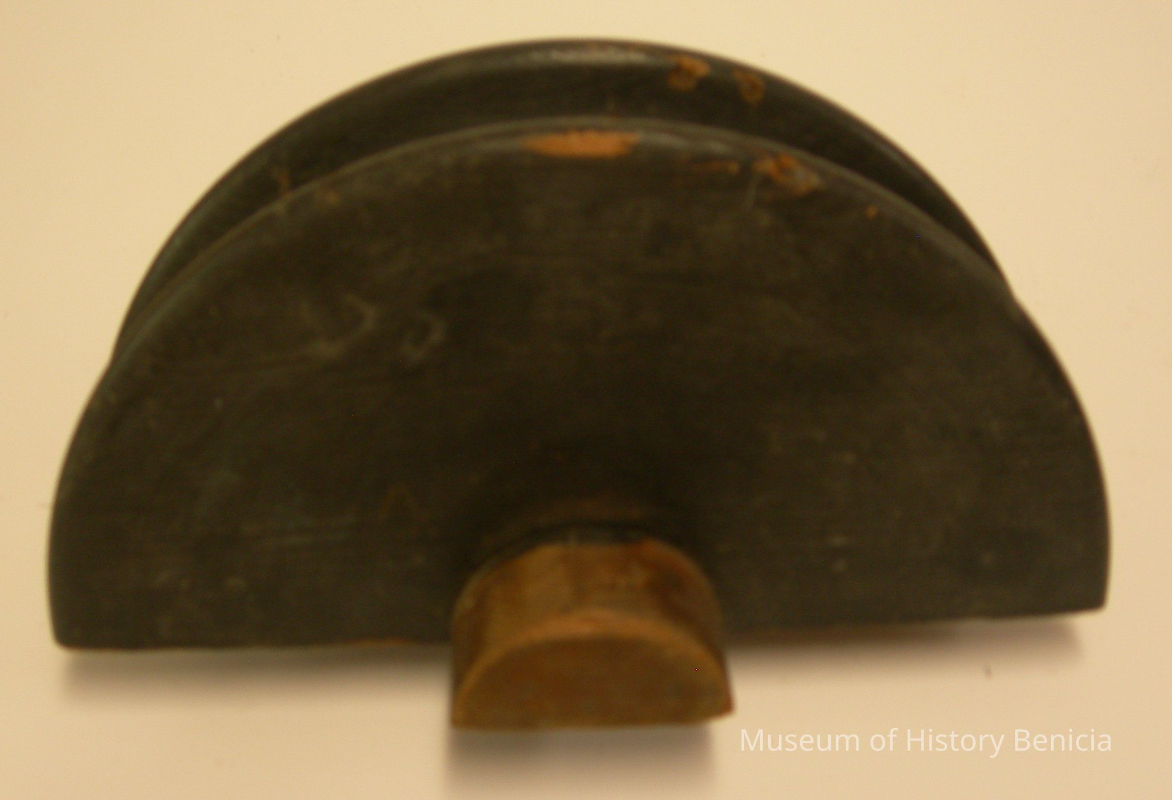 Yuba Pattern - Black/brown; half-round; stamped in on back: "O"; has pegs on back to fit companion piece; 2-1/2" edge is ridged; 4-1/2" wide x 9" long x 5" tall.Collection