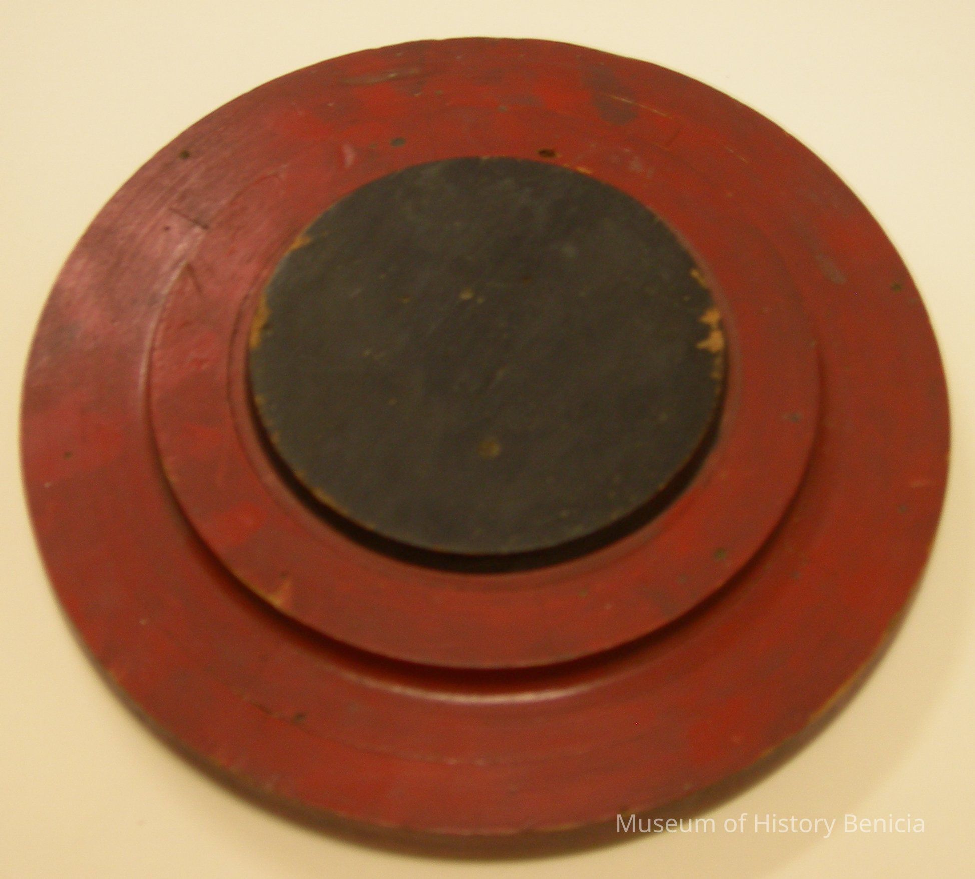 four layers: 1) bottom unpainted 8-1/2" diameter x 3/8" tall; 2) next up dull red 11-3/4" diameter x 5/8" tall; 3) next up dull red 8-1/8" diameter x 1/2" tall; 4) top black 5-3/4" diameter x 3/8" tall; 1-7/8" tall overall.Collection