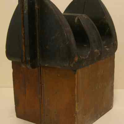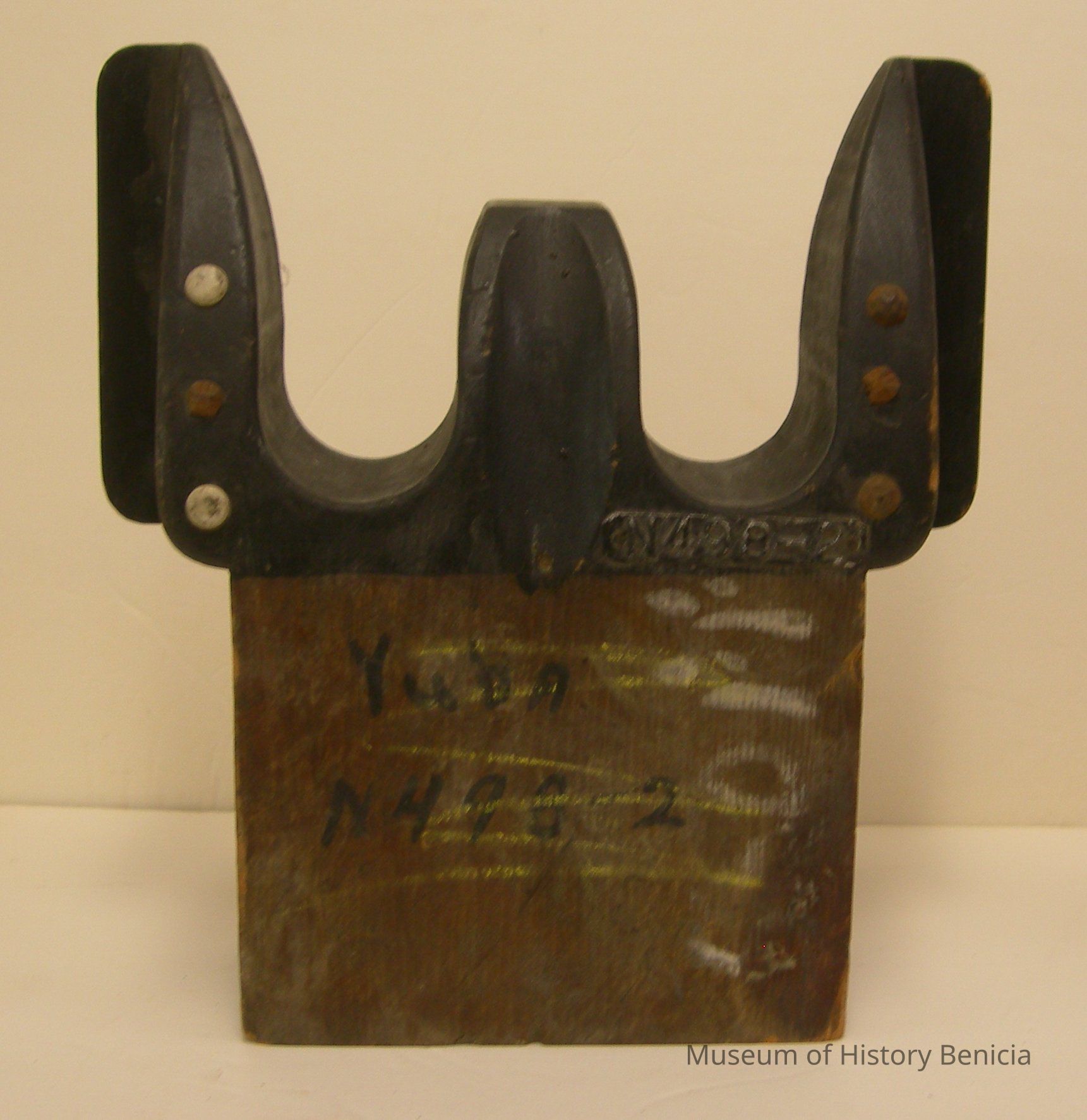 Yuba Pattern - Black/brown; black lettering: "Yuba / N498-2"; metal tag: "N498-2"; has three upholstery tacks on each outer section of the "W" shape; has holes in back to fit companion piece; two sections: 1) bottom square-ish 6-3/4" wide x 3-1/4" deep x 5-1/4" tall;