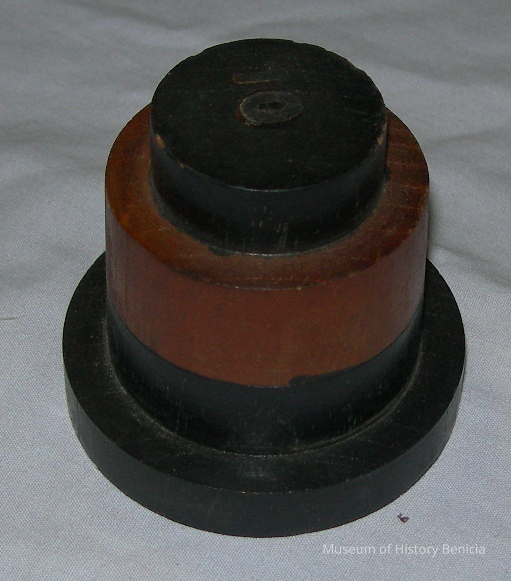 wooden casting pattern from Yuba Manufacturing Company. three layers, 3" diameter at bottom, 1-1/4" at top, 3" high