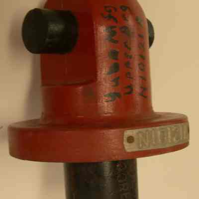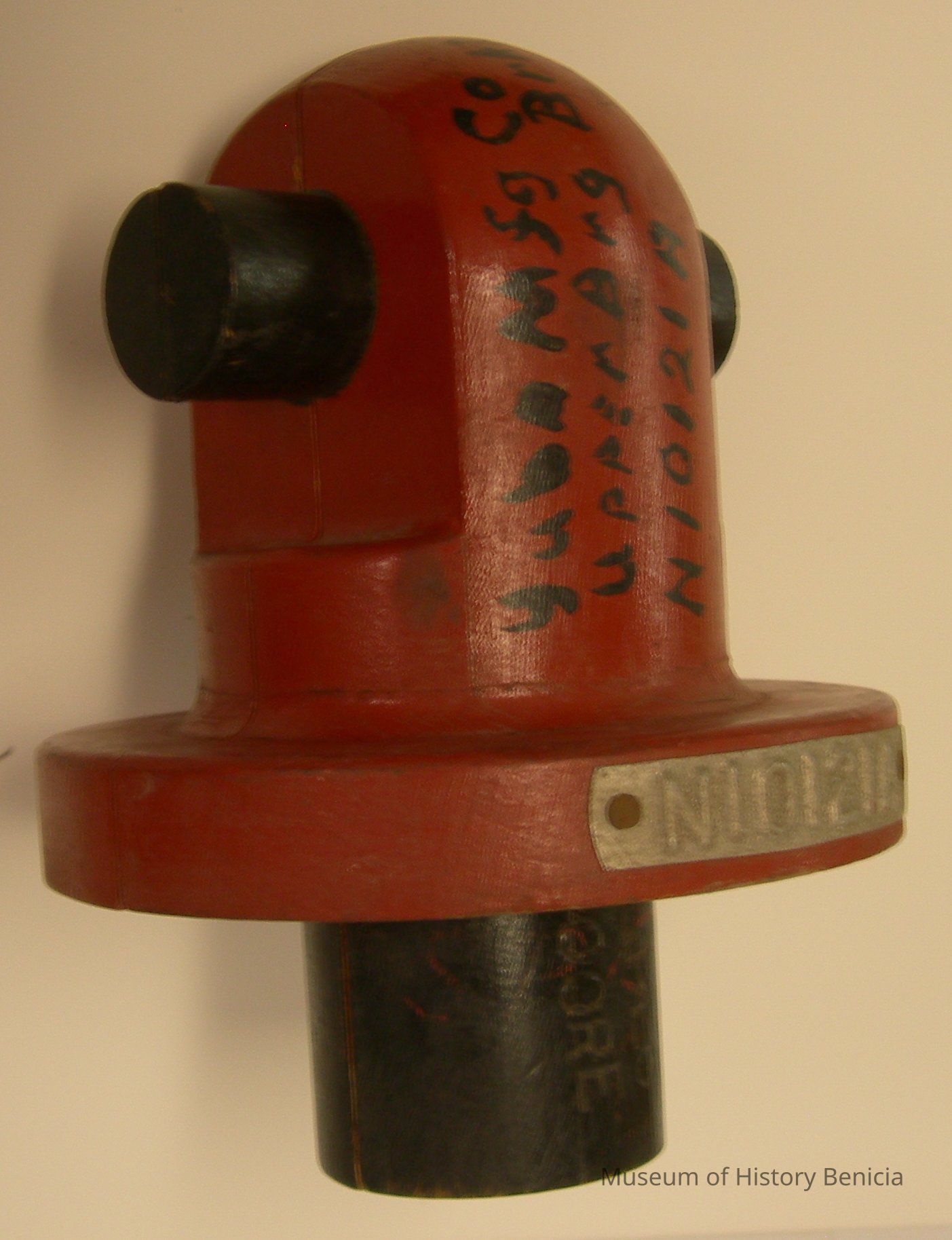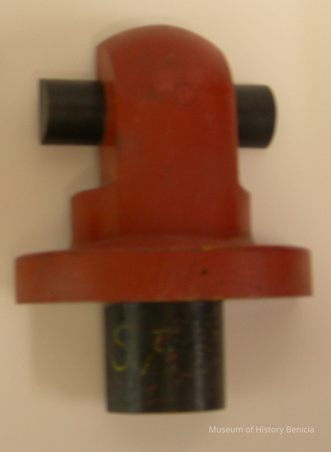 Yuba Pattern - Dull red with black; stamped in "SPEC CORE"; four sections: 1) bottom 1/2 rund 1-1/8 radius x 2" tall; 2) next up 3-1/4 radius x 1" tall; 3) top 3-1/2 wide x 1-1/2" deep x 4-1/4" tall; 4) extra across top 1/2" round 4-1/2" long x 5/8" radius; 7" tall overall; has pegs on back to fit its companion piece.Collection