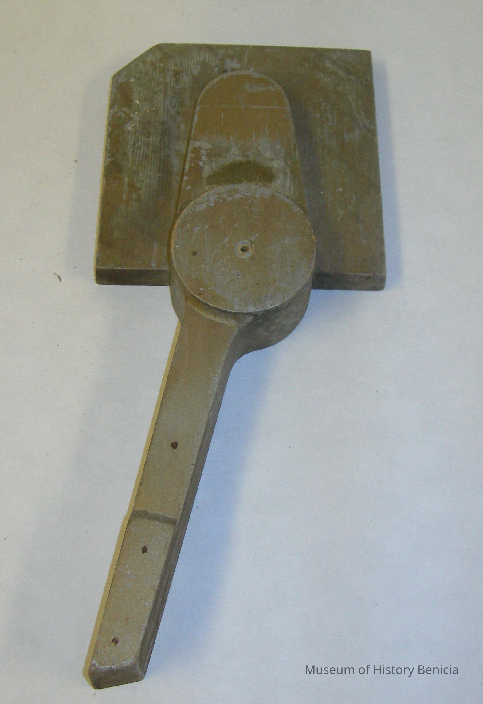 Yuba Mtg. Co. square piece with handle extending from it; connects to BHM2006.100.0010 with 2 dowels; painted gold; on back is written MOFFETT MFG Co. 4968-12Collection