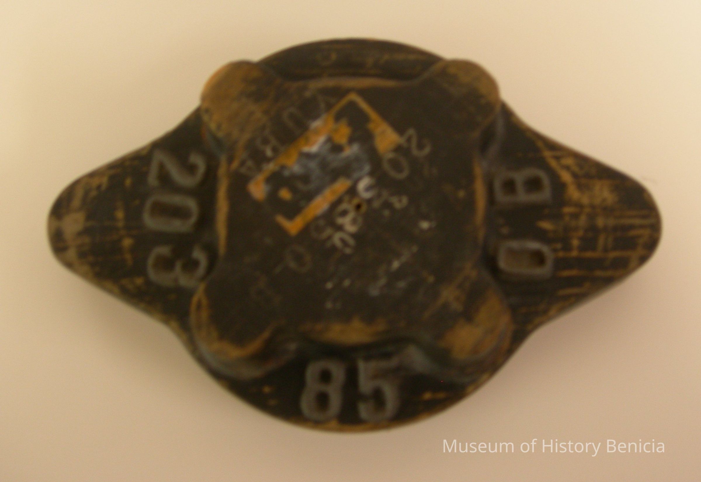 Yuba Pattern - Black and unpainted section; multiple markings: black lettering: "Yuba Mfg Co / End cap 203850B"; individually attach numbers: "203850B"; stamped in on top "203850B" twice and "YUBA"; two odd shaped sections: