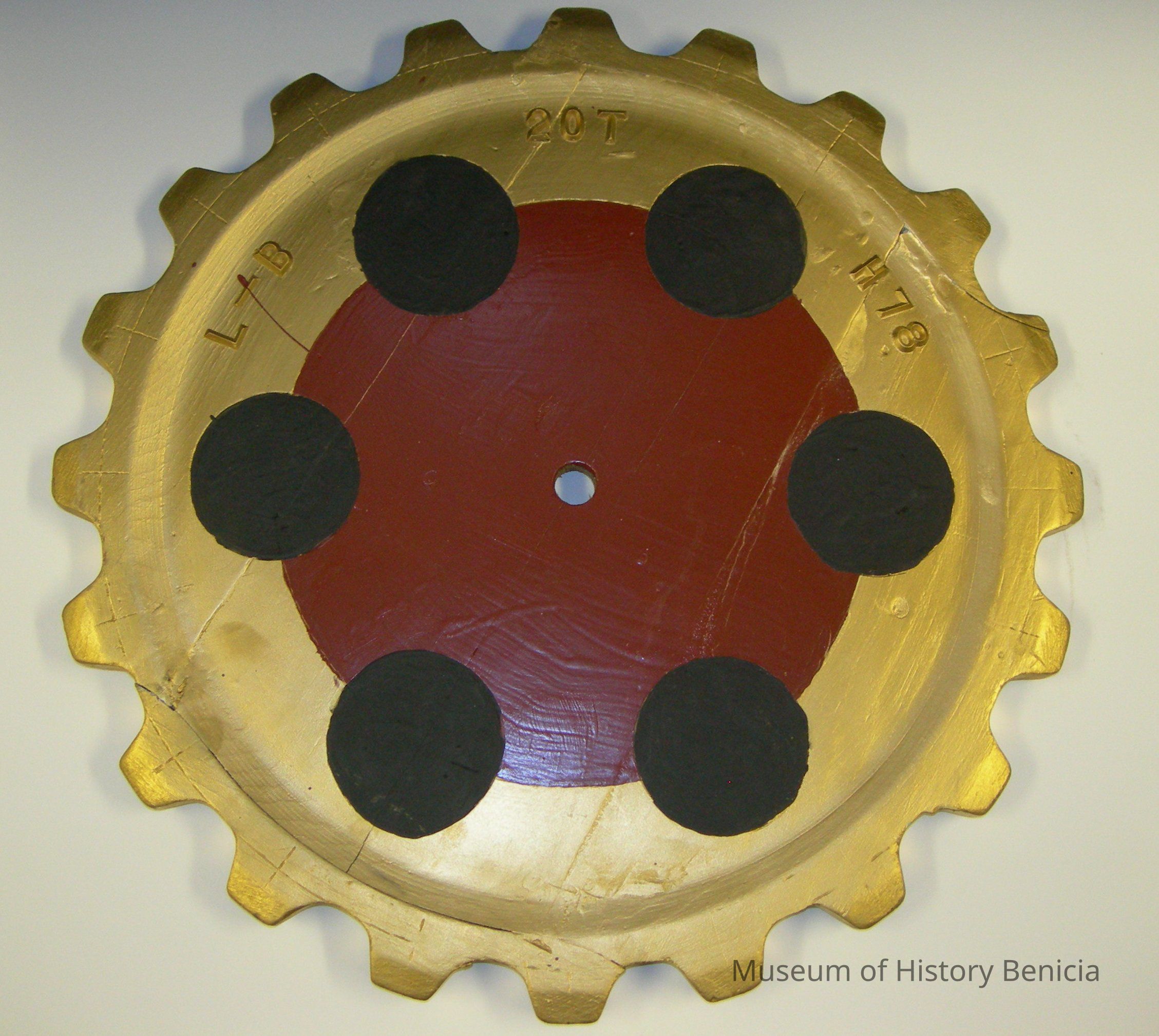 circular painted gold with reddish brown circle center and 6 black circle around it