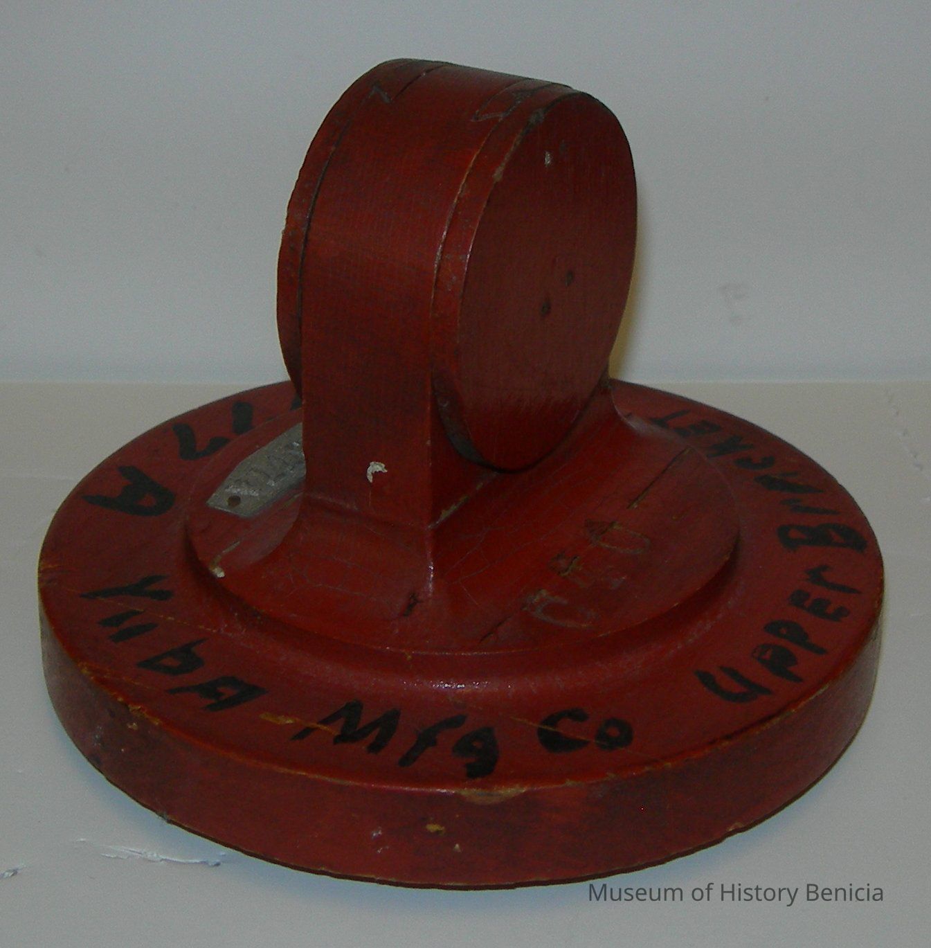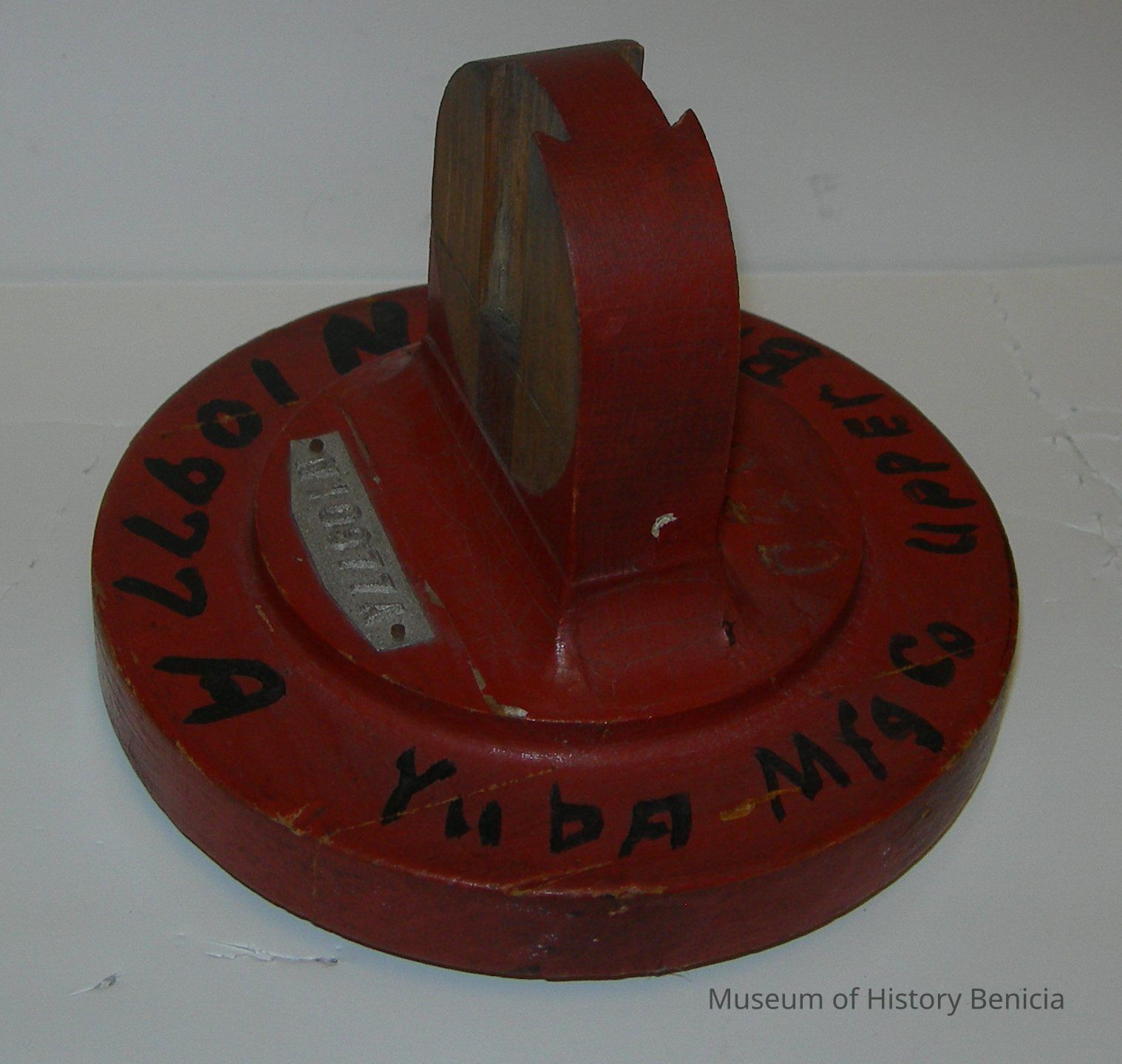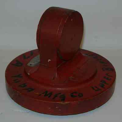 Yuba Pattern - Dull red with black lettering: "Yuba Mfg. Co. Upper Bracket N10977A"; metal tag: "N10977A"; stamped in "C402"; round bottom: 5" diameter x 1-1/4" tall; top piece: 3-1/4" diameter ridge x 1/4"; center top: 2-1/4" wide x 3/4" deep x 2-1/2" tall.Collection