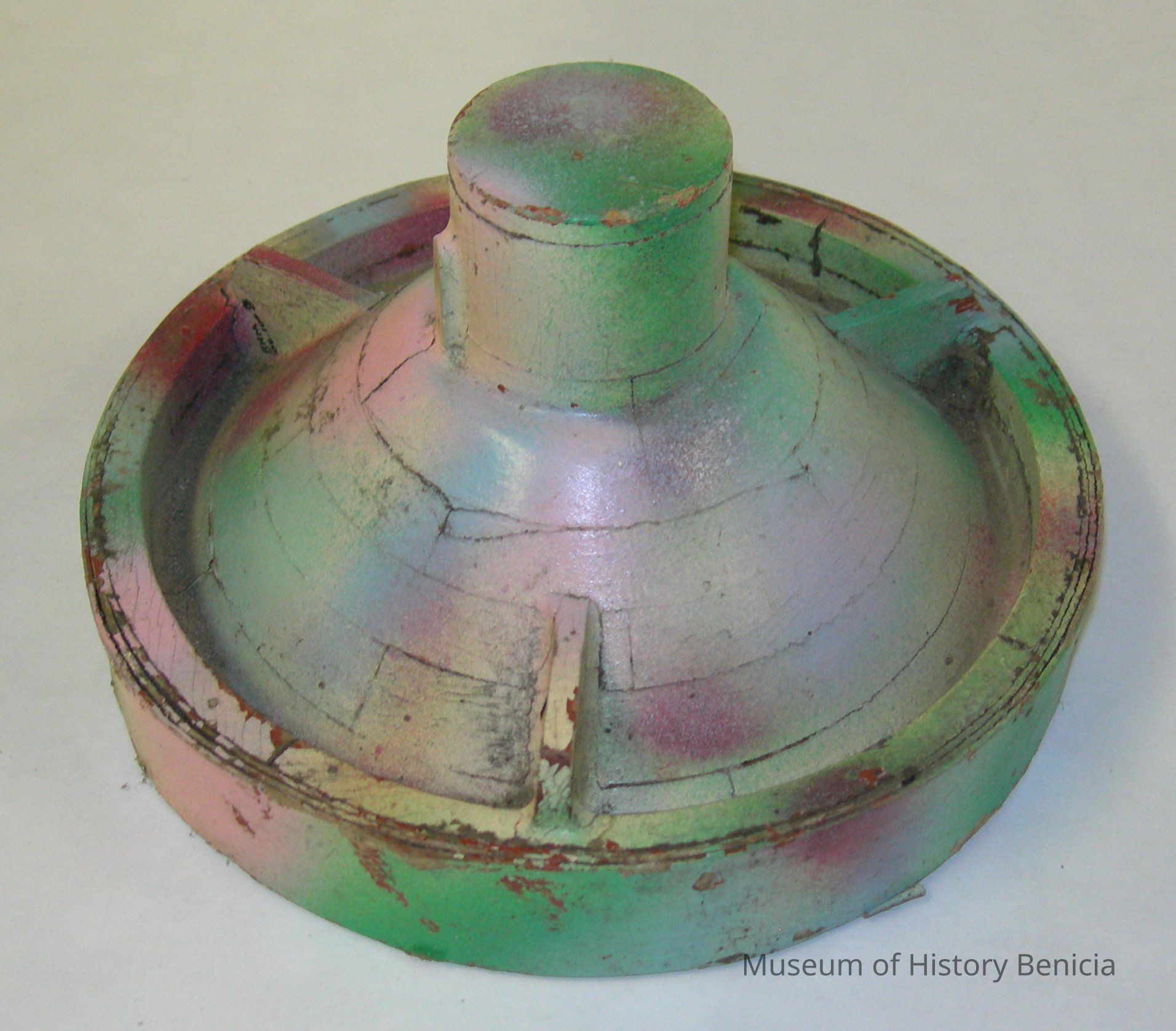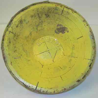 Yuba Mtg. Co. mold, semi cone shaped, yellow inside w/number N9379B, multi colored outside/top, one metal screw