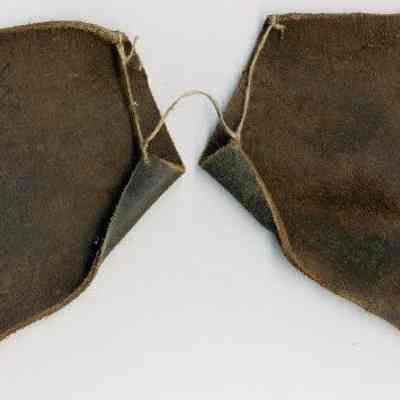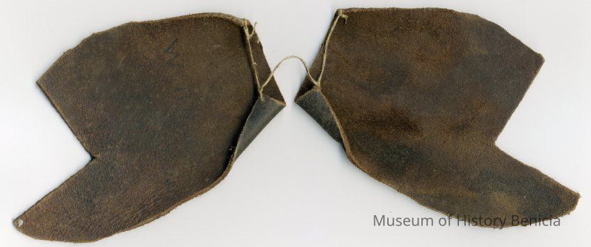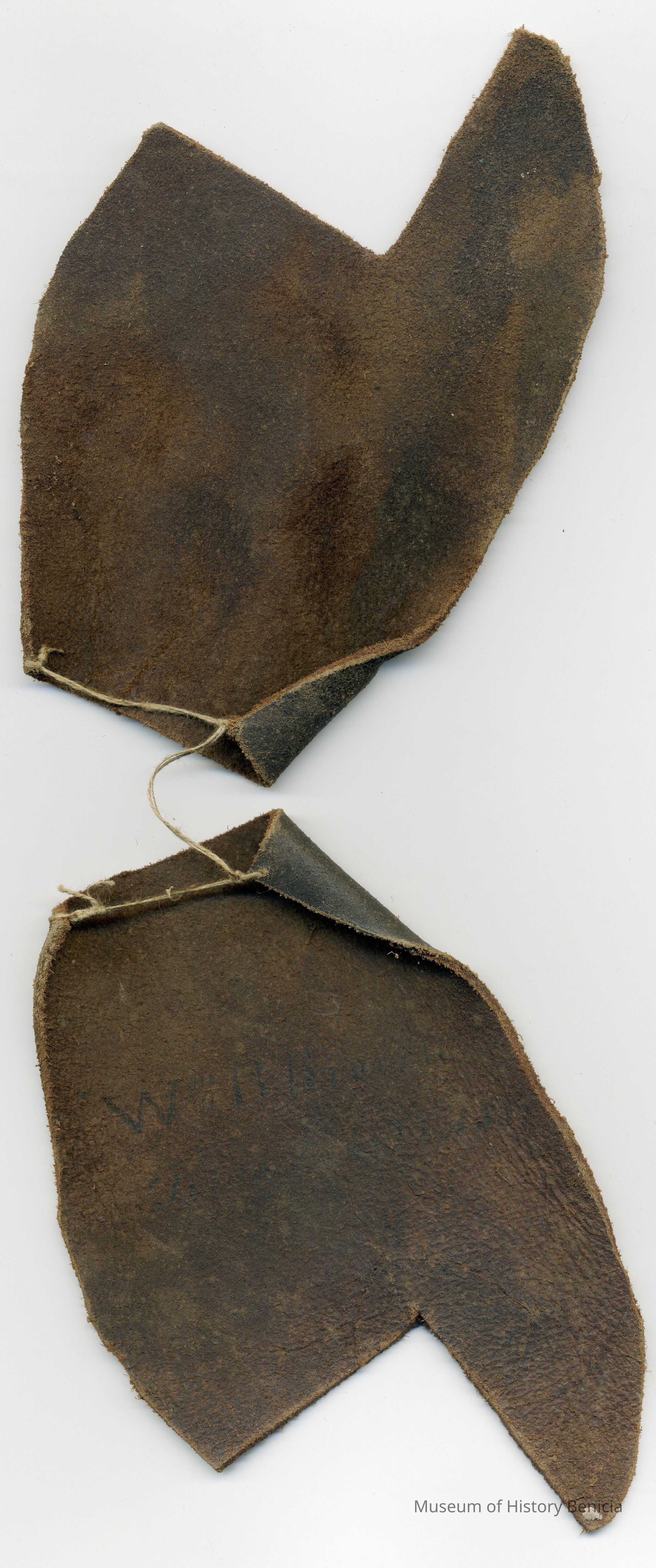 Sample earmarkings on two pieces of leather tied together with twine for an unknown individual, registration date is unknown as no information is written in a Ledger of the Solano County Recorder 1855-1916.
