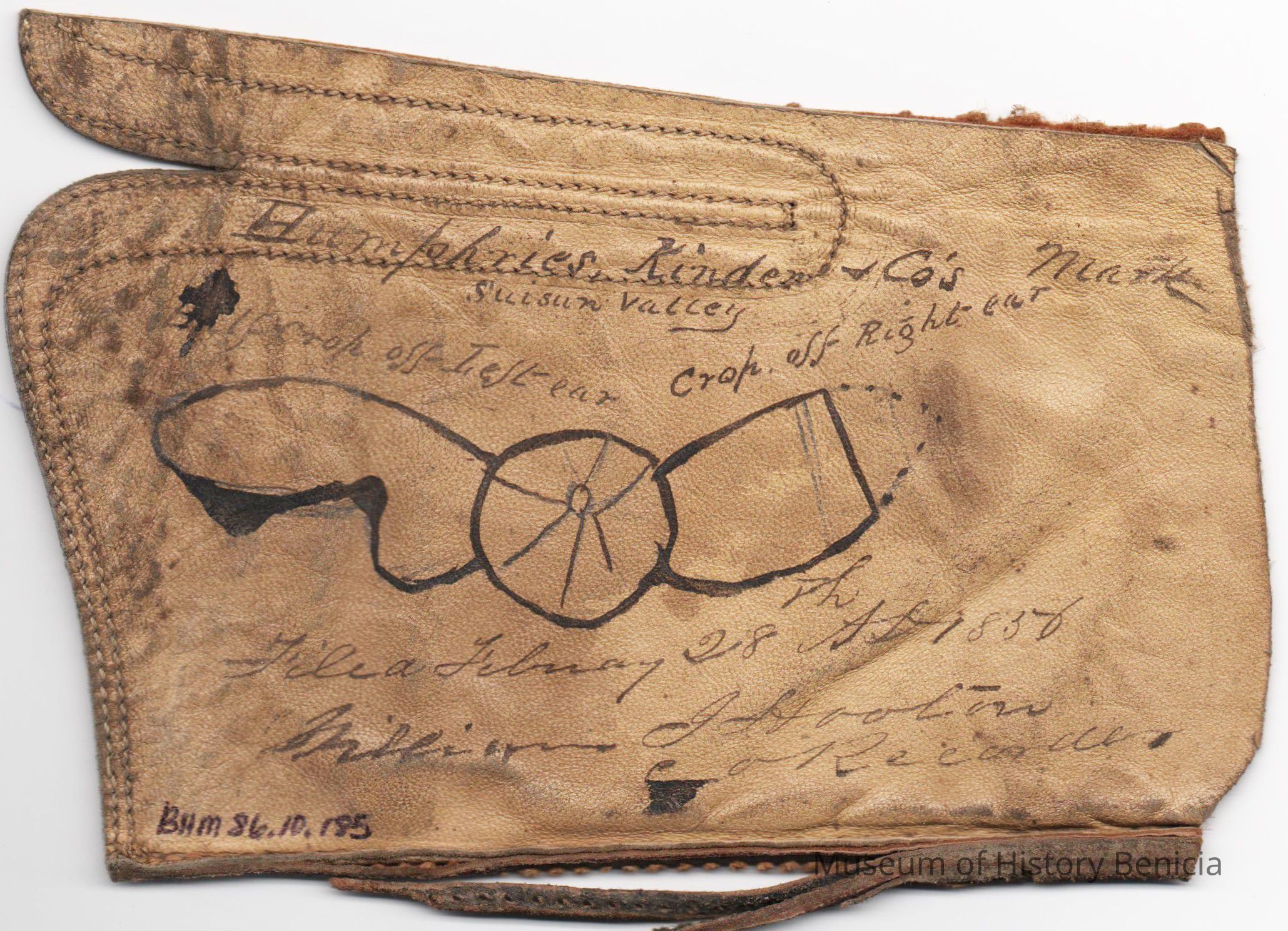 Sample earmarkings on a piece of leather for Humphries, Kinder & Co., registered on February 28, 1856, as written in a Ledger of the Solano County Recorder 1855-1916. (page 3)