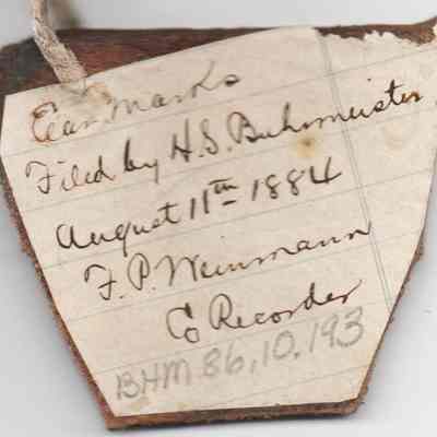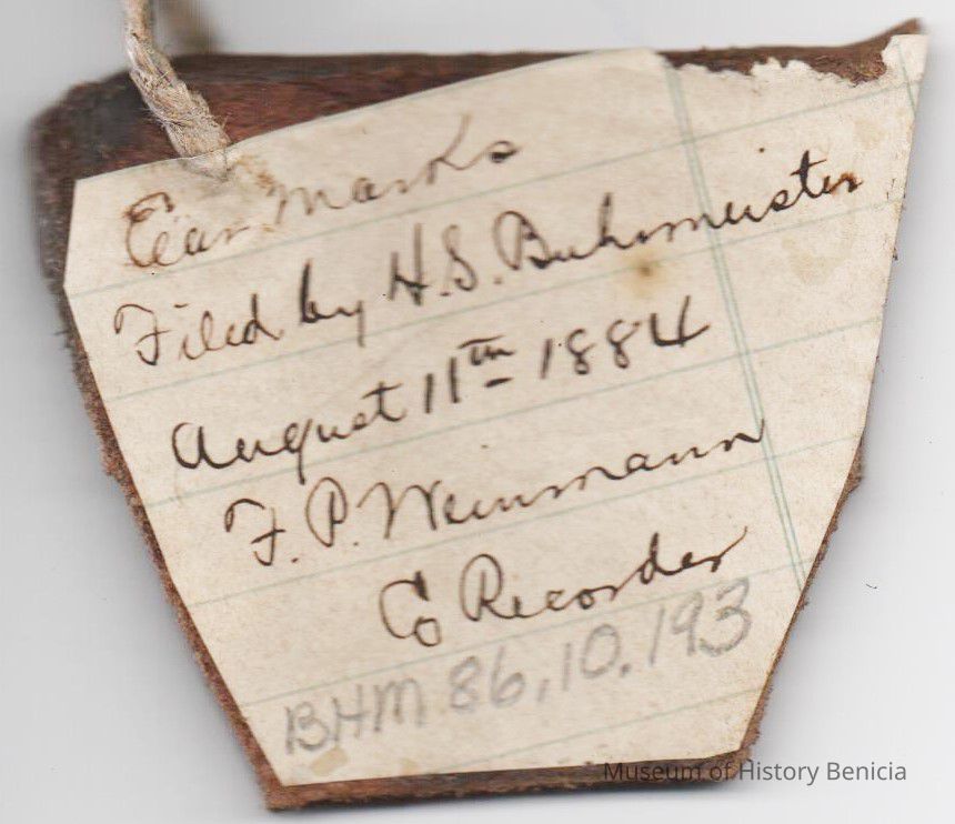 Sample earmarkings on two pieces of leather for H.S. Buhmeister, registered on August 11, 1884, as written in a Ledger of the Solano County Recorder 1855-1916. (page 92)