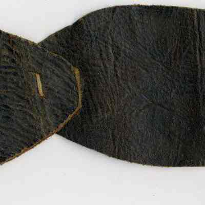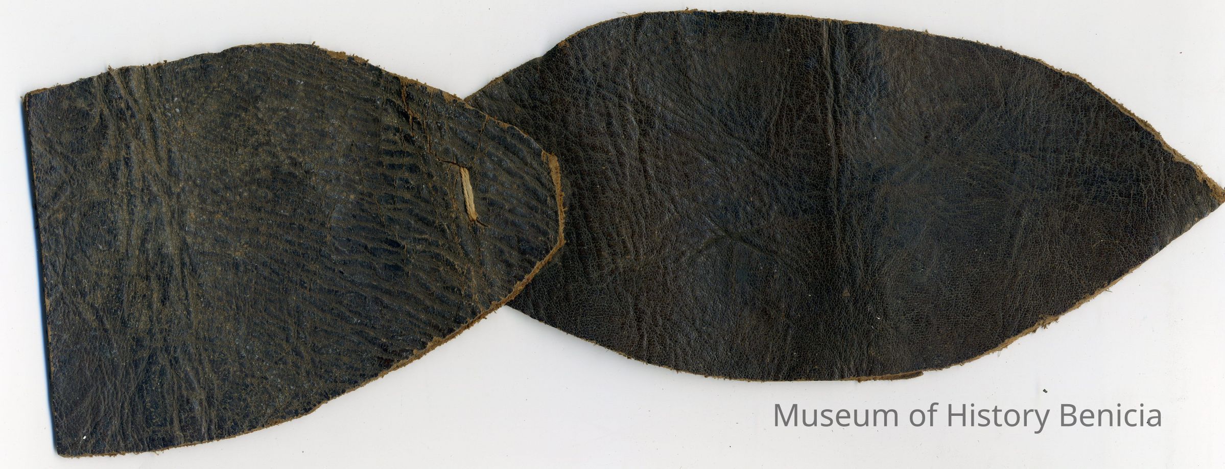 Sample earmarks on two pieces of leather (connected by a single string stitch) for an unknown individual, registration date is unknown because no information is written in a Ledger of the Solano County Recorder 1855-1916.