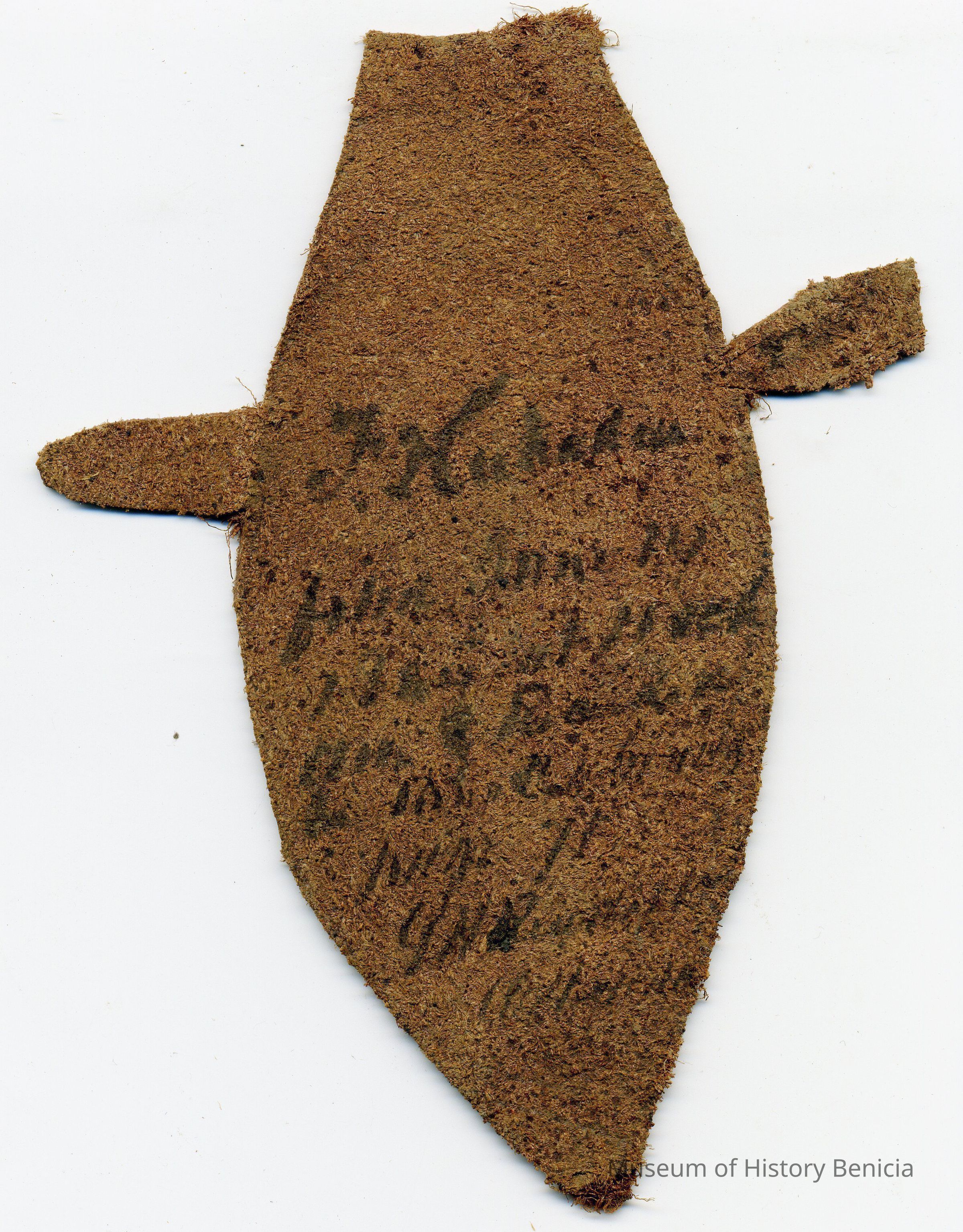Sample earmarking on a piece of leather for F. Ruhaden, registered June 14, 1864, and is written in a Ledger of the Solano County Recorder 1855-1916. (page 71)