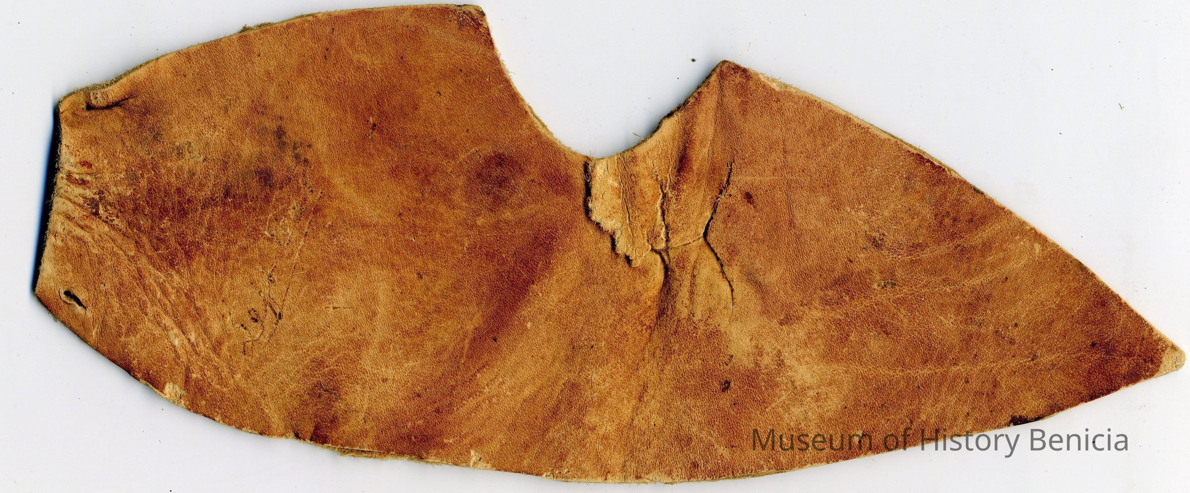 Sample earmarking with no information attached or written on the leather; it is ear-shaped with a semi-circle cut from one side. It did not appear in the Solano County Ledger of Brands 1854-1917.Collection